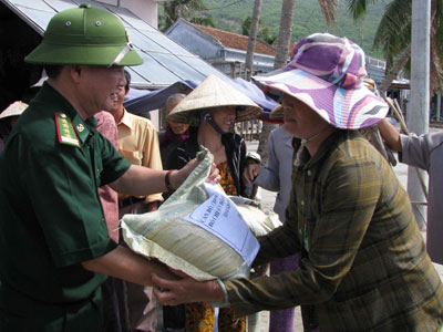 | Đại tá Hồ Văn Truyền - Chỉ huy trưởng Bộ đội Biên phòng tỉnh tặng gạo cho người dân thôn Ninh Đảo, xã Vạn Thạnh. |