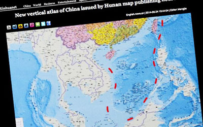 Để dọn đường cho hành vi xâm lấn Biển Đông, Trung Quốc từng tự trưng ra cái bản đồ gồm 9 khúc, tức 9 nét gạch đậm đứt gãy có hình dạng na ná cái lưỡi bò khổng lồ. Thời gian gần đây, cái bản đồ chỉ còn lại 8 khúc, sau khi Trung Quốc và Việt Nam ký kết phân định vùng biển Vịnh Bắc Bộ. Thế rồi, bỗng dưng, trong những ngày cuối tháng 6-2014, Trung Quốc lại tung ra cái bản đồ chiều dọc, không còn là 9 khúc hay 8 khúc, mà là 10 đoạn. 9 khúc, 8 khúc hay 10 đoạn, về bản chất, không có gì khác, đều thể hiện ý đồ bao chiếm, xâm lấn gần trọn Biển Đông. Thứ bản đồ này thể hiện sự ngang ngược, phi lý và thách thức công lý, lẽ phải.