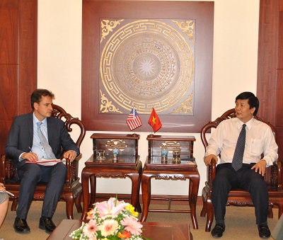 | Ông Trần Sơn Hải (phải) thông tin tới ngài M. Patrick Ellsworth về tình hình kinh tế - xã hội của tỉnh Khánh Hòa. |