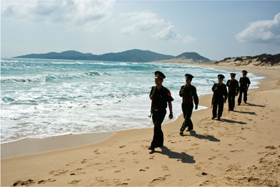 | Cán bộ, chiến sĩ Đồn Biên phòng Cam Hải Đông tuần tra ven biển. |