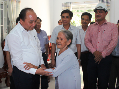 Phó Thủ tướng Nguyễn Xuân Phúc đến thăm gia đình bà Trần Thị Cúc khi về ở khu tái định cư Suối Hiệp. |