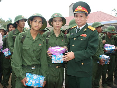 Lãnh đạo Bộ chỉ huy Quân sự tỉnh Khánh Hòa động viên thanh niên TP. Cam Ranh trước khi lên đường nhập ngũ năm 2013. |