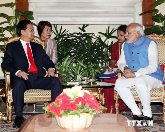 Tại Ấn Độ, Thủ tướng Nguyễn Tấn Dũng đã gặp riêng và hội đàm với Thủ tướng nước chủ nhà Narendra Modi; hội kiến Tổng thống Ấn Độ Pranab Mukherjee (Pra-náp Mu-khơ-gi), gặp Phó Tổng thống – Chủ tịch Thượng viện Mohammad Hamid Ansari (Mô-ham-mát Ha-mít An-sa-ri), tiếp Chủ tịch Hạ viện Sumitra Mahajan (Su-mi-tra Ma-ha-gian) và Bộ trưởng Ngoại giao Sushma Swaraj (Xút-ma Xoa-rai); tiếp ông Jitan Ram Manjihi (Gin-tan Ram Man-gi-hi), Thủ hiến bang Bihar (Bi-ha); dự và phát biểu tại Diễn đàn Thương mại và Đầu tư Việt Nam - Ấn Độ; tiếp lãnh đạo một số tập đoàn kinh tế lớn của Ấn Độ như TATA, ESSAR, ILFS, hãng hàng không Jet Airways…