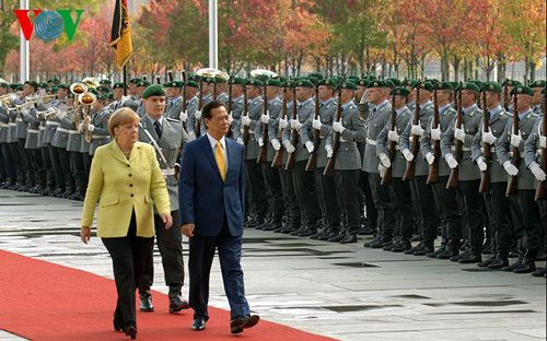 Tiếp tục các hoạt động trong chương trình thăm chính thức Đức, chiều tối 15/10 theo giờ Việt Nam, ở thủ đô Berlin, Thủ tướng Đức Angela Markel chủ trì trọng thể lễ đón Thủ tướng Nguyễn Tấn Dũng và Đoàn đại biểu cấp cao Việt Nam sang thăm chính thức Đức.