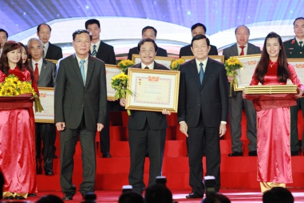 | Chủ tịch nước Trương Tấn Sang và Bộ trưởng Bộ GD&ĐT Phạm Vũ Luận trao tặng danh hiệu và chúc mừng các Nhà giáo nhân dân. |