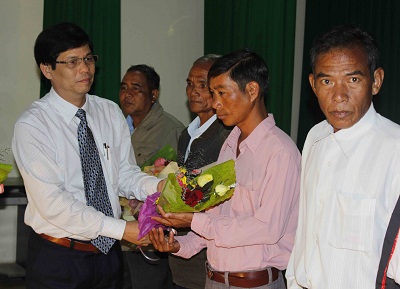 | Lãnh đạo tỉnh tặng hoa động viên các già làng, trưởng thôn tiêu biểu. |