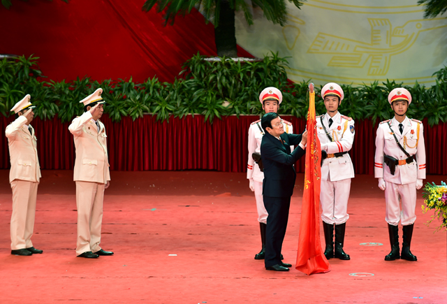 | Chủ tịch nước Trương Tấn Sang gắn Huân chương Sao vàng lên lá cờ truyền thống của lực lượng Công an nhân dân. Ảnh VGP/Nhật Bắc |
