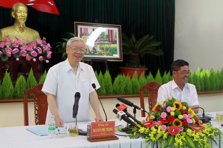 Ngày 4-5, Tổng Bí thư Nguyễn Phú Trọng đến thăm, làm việc tại Khánh Hòa, kiểm tra tình hình triển khai thực hiện Nghị quyết Đại hội XII của Đảng, Nghị quyết Đại hội Đảng bộ tỉnh lần thứ XVII; công tác chuẩn bị bầu cử đại biểu Quốc hội khóa XIV và đại biểu HĐND các cấp nhiệm kỳ 2016 - 2021; tình hình thực hiện nhiệm vụ kinh tế - xã hội (KT-XH), quốc phòng - an ninh, công tác xây dựng Đảng, xây dựng hệ thống chính trị trên địa bàn. Cùng đi với Tổng Bí thư có ông Nguyễn Văn Bình - Ủy viên Bộ Chính trị, Trưởng ban Kinh tế Trung ương; đại diện lãnh đạo nhiều ban, bộ, ngành, cơ quan Trung ương. Dự buổi làm việc, về phía địa phương có các ông: Lê Thanh Quang - Ủy viên Trung ương Đảng, Bí thư Tỉnh ủy, Chủ tịch HĐND tỉnh; Nguyễn Tấn Tuân - Phó Bí thư Thường trực Tỉnh ủy, Trưởng đoàn Đại biểu Quốc hội tỉnh; Lê Đức Vinh - Phó Bí thư Tỉnh ủy, Chủ tịch UBND tỉnh; lãnh đạo các sở, ban, ngành.