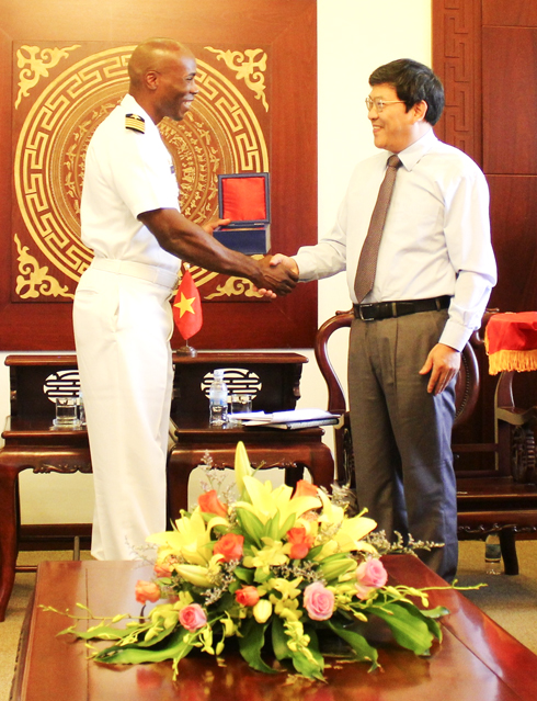 Chiều 5-7, ông Nguyễn Duy Bắc - Phó Chủ tịch UBND tỉnh Khánh Hòa tiếp xã giao Đoàn sĩ quan chỉ huy 2 tàu Hải quân Hoa Kỳ, do Đại tá Lex Walker - Chỉ huy Biên đội tàu khu trục số 7 dẫn đầu.