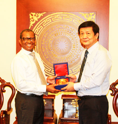 Ông Trần Sơn Hải tặng quà lưu niệm cho ngài đại sứ Cộng hòa Nam Phi. |