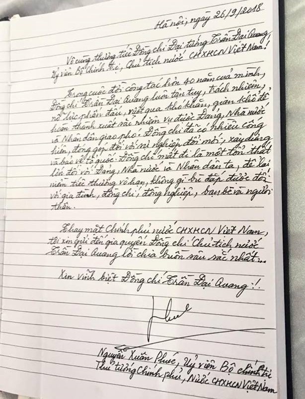 Vô cùng thương tiếc Đồng chí Đại tướng Trần Đại Quang, Ủy viên Bộ Chính trị, Chủ tịch nước Cộng hòa xã hội chủ nghĩa Việt Nam, Thủ tướng Chính phủ Nguyễn Xuân Phúc ghi sổ tang: