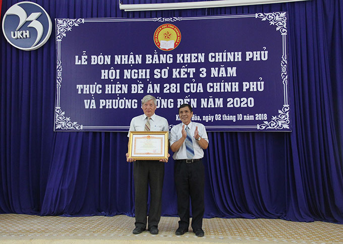 Ông Phan Thông trao Bằng khen của Thủ tướng Chính phủ cho đại diện Hội Khuyến học tỉnh Khánh Hòa.