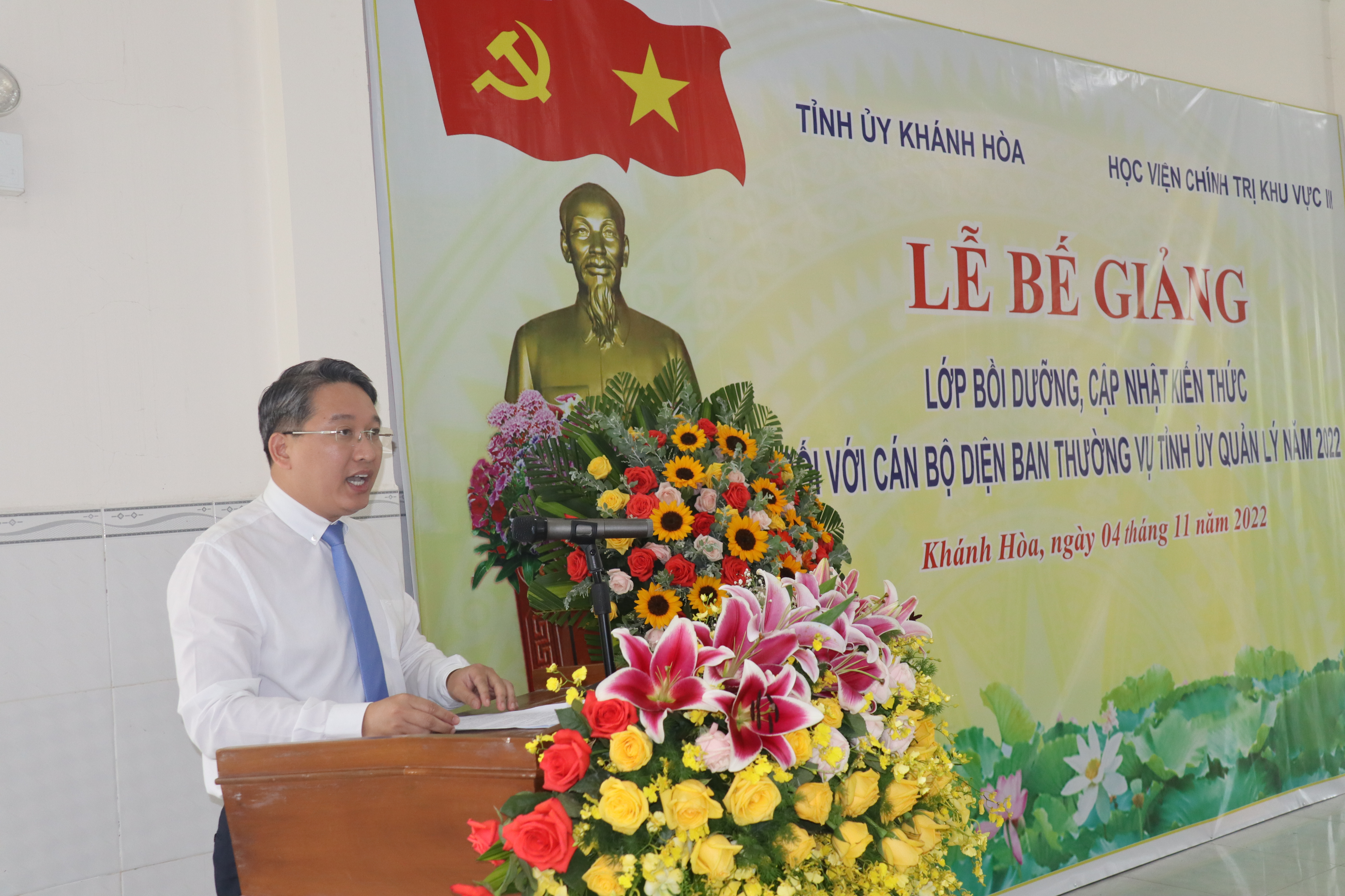 Ngày 4-11, tại Trường Chính trị tỉnh, Tỉnh ủy Khánh Hòa phối hợp với Học viện Chính trị khu vực III tổ chức bế giảng lớp bồi dưỡng, cập nhật kiến thức đối với cán bộ diện Ban Thường vụ Tỉnh ủy quản lý năm 2022.