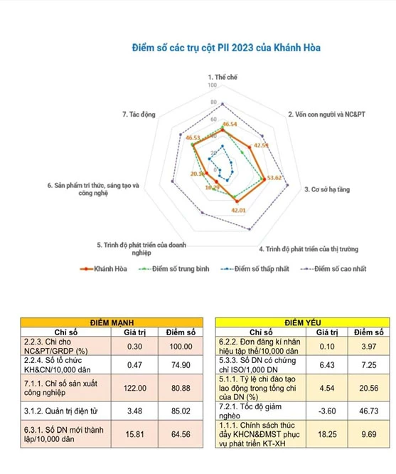 Đối với 14 địa phương vùng Bắc Trung bộ và Duyên hải miền Trung, Đà Nẵng dẫn đầu khu vực và cũng nằm trong top 5 địa phương có điểm số cao nhất cả nước. Khánh Hòa xếp thứ 7/14 địa phương trong khu vực với số điểm 36,78. Báo cáo PII 2023 đã chỉ ra 5 điểm mạnh của Khánh Hòa, tập trung ở các nội dung: Chi cho nghiên cứu và phát triển/GRDP (%); đơn đăng kí nhãn hiệu tập thể/10.000 dân; số tổ chức khoa học và công nghệ /10.000 dân; số doanh nghiệp có chứng chỉ ISO/1.000 doanh nghiệp; chỉ số sản xuất công nghiệp. Báo cáo PII 2023 cũng chỉ ra 5 nội dung tiêu chí điểm tỉnh cần cải thiện gồm: Tỷ lệ chi đào tạo lao động trong tổng chi của doanh nghiệp; quản trị điện tử; tốc độ giảm nghèo; số doanh nghiệp mới thành lập/10.000 dân; chính sách thúc đẩy khoa học công nghệ và đổi mới sáng tạo phục vụ phát triển kinh tế - xã hội.