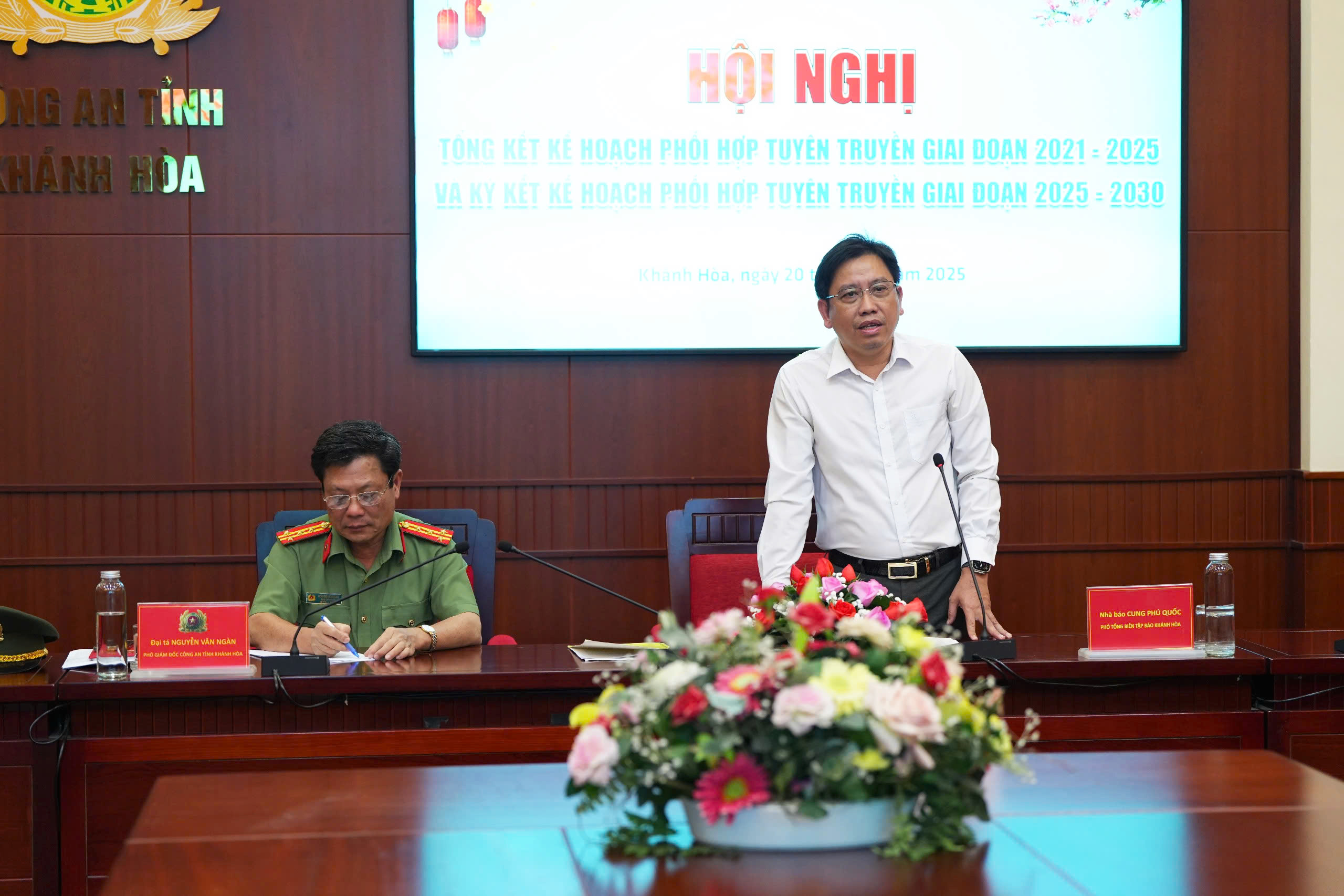 Chiều 20-1, Công an tỉnh - Báo Khánh Hòa tổ chức hội nghị tổng kết kế hoạch phối hợp tuyên truyền giai đoạn 2021 - 2025 và ký kết kế hoạch phối hợp tuyên truyền giai đoạn 2025 - 2030. Đại tá Nguyễn Văn Ngàn - Phó Giám đốc Công an tỉnh; ông Cung Phú Quốc - Phó Tổng Biên tập Báo Khánh Hòa đồng chủ trì hội nghị.