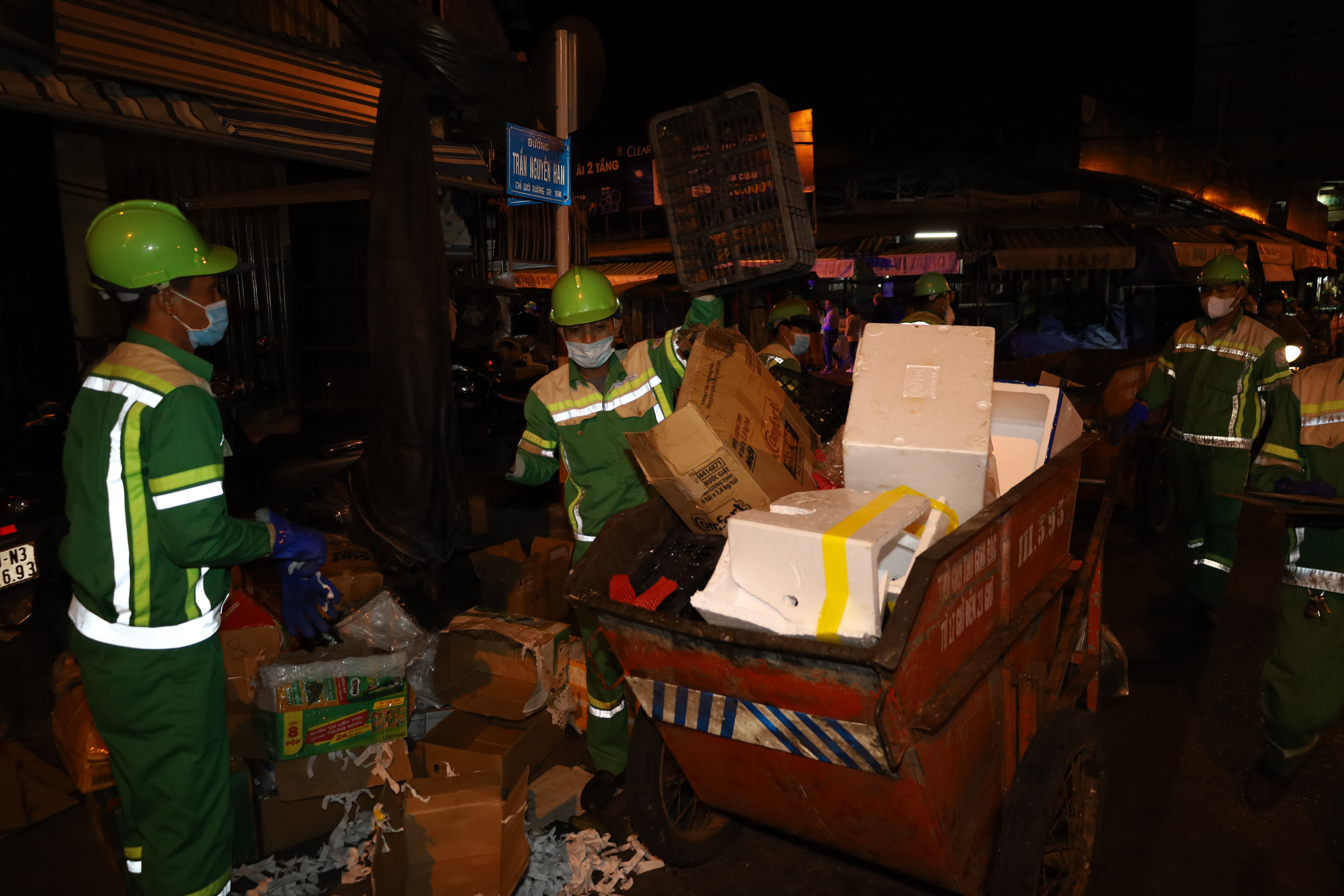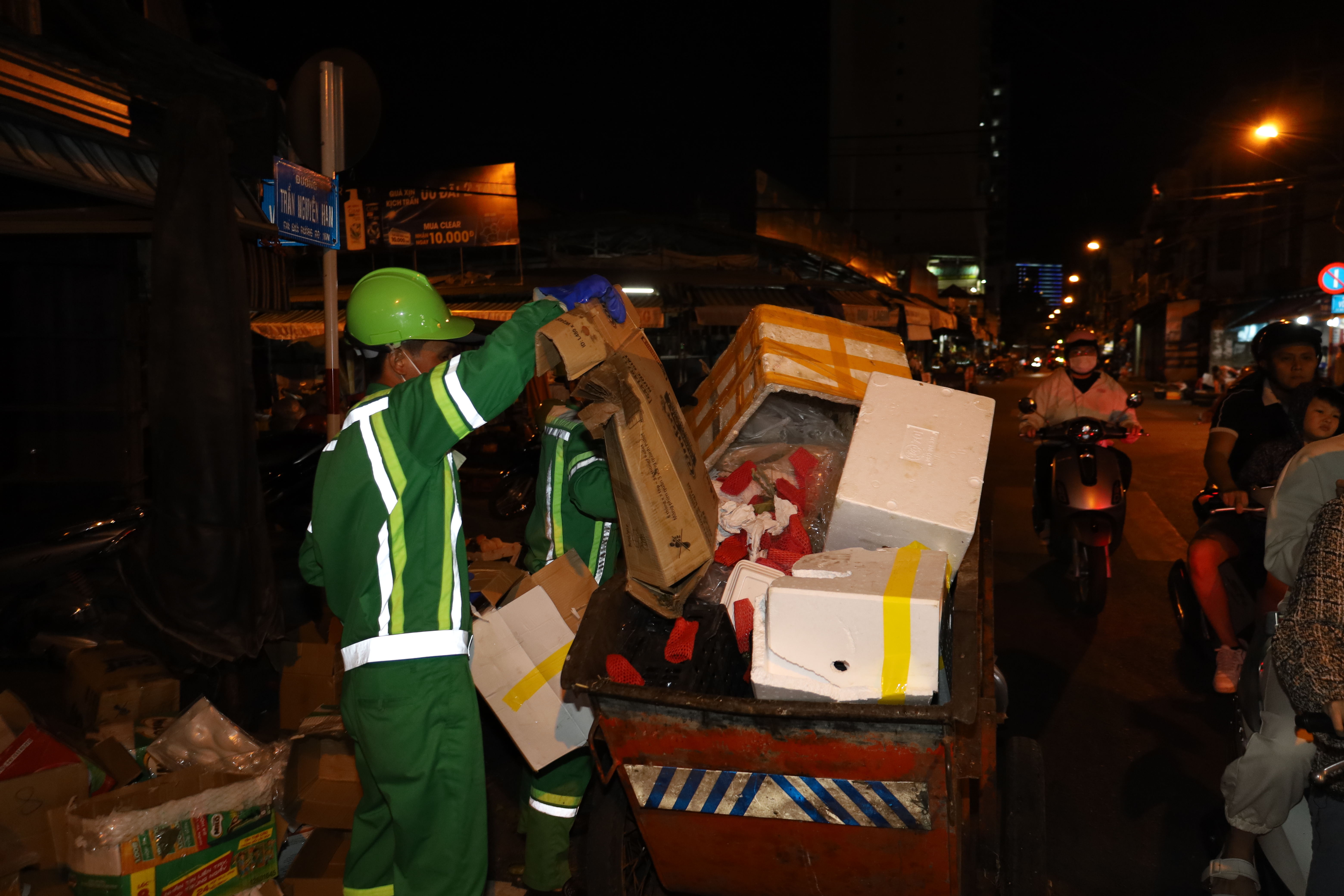 | Công nhân thu gom rác khu vực chợ Xóm Mới. |