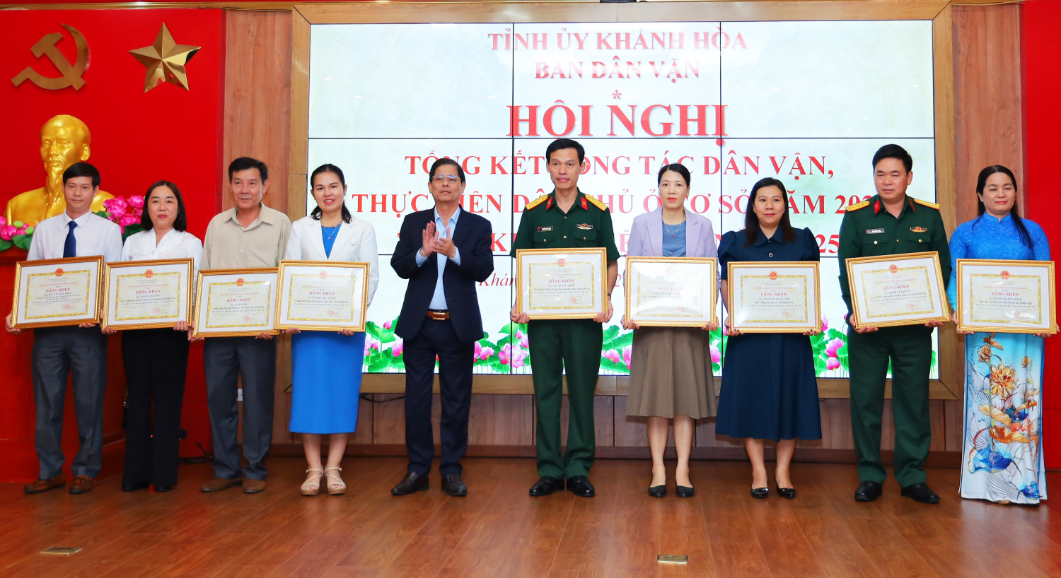 Chiều 20-1, Ban Dân vận Tỉnh ủy Khánh Hòa tổ chức hội nghị tổng kết công tác dân vận, thực hiện dân chủ ở cơ sở năm 2024, triển khai nhiệm vụ năm 2025. Các ông: Nguyễn Khắc Toàn - Phó Bí thư Thường trực Tỉnh ủy, Chủ tịch HĐND tỉnh; Nguyễn Tấn Tuân - Phó Bí thư Tỉnh ủy, Chủ tịch UBND tỉnh; Nguyễn Anh Tuấn - Trưởng Ban Dân vận Tỉnh ủy đồng chủ trì hội nghị. Dự hội nghị còn có bà Trần Thu Mai - Ủy viên Ban Thường vụ Tỉnh ủy, Chủ tịch UBMTTQ Việt Nam tỉnh.
