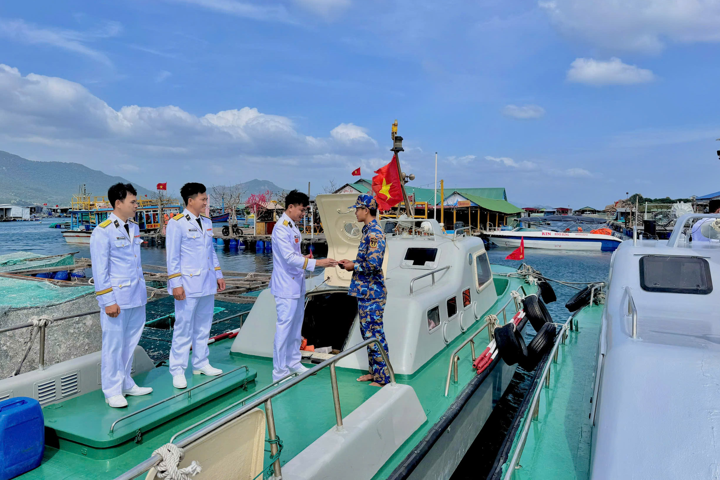 | Tiểu đoàn 458 kiểm tra, chúc Tết các xuồng trực tại đảo Bình Hưng. |