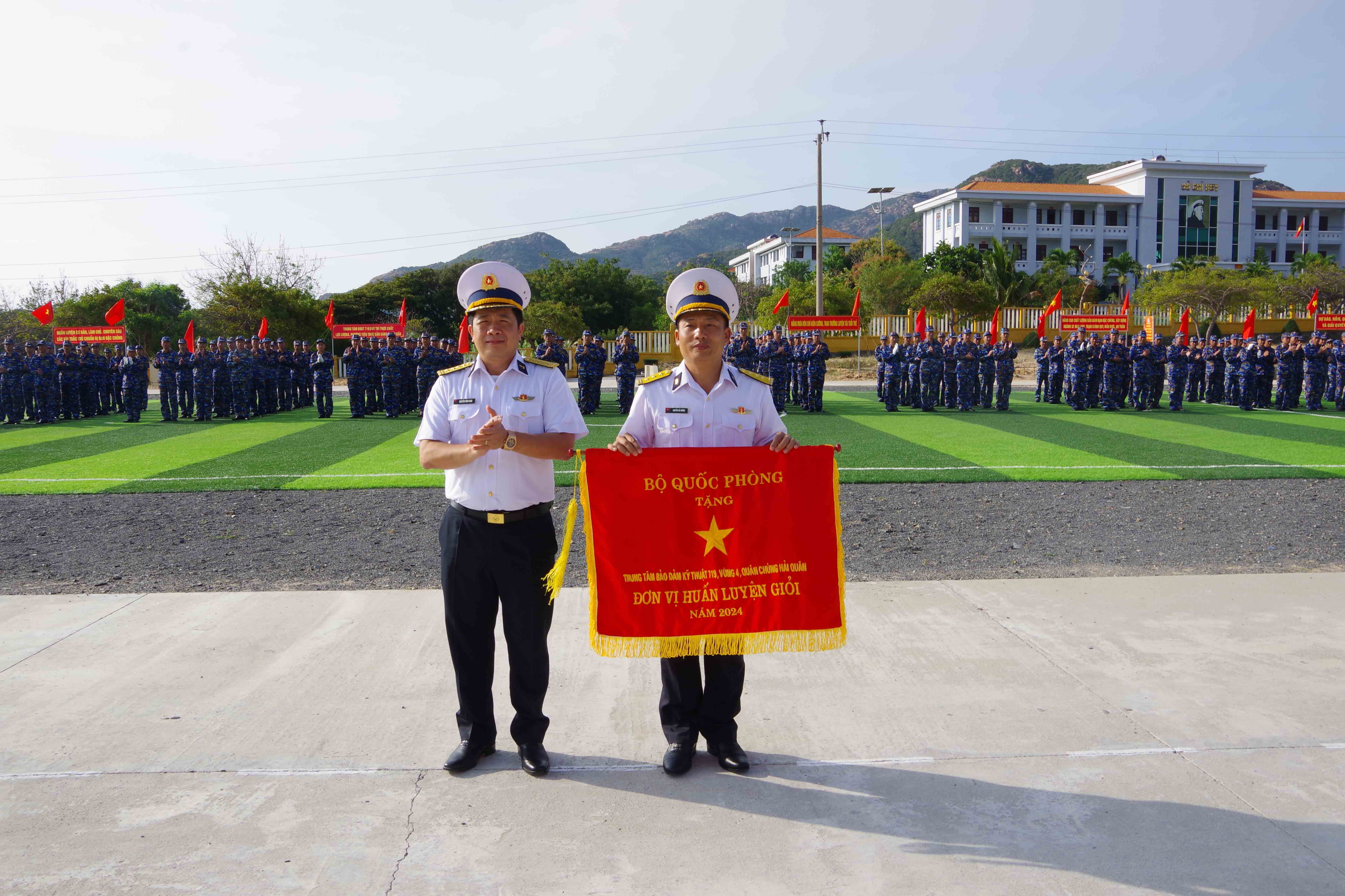| Phó Tư lệnh Vùng 4 Hải quân Nguyễn Vĩnh Nam trao cờ Đơn vị huấn luyện giỏi cấp Bộ Quốc phòng cho trung tâm. |