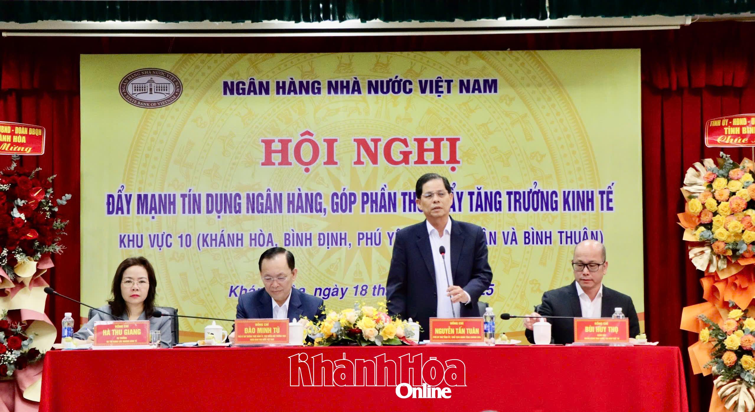 Sáng 18-3, tại TP. Nha Trang, Ngân hàng Nhà nước (NHNN) Việt Nam tổ chức Hội nghị đẩy mạnh tín dụng ngân hàng, góp phần thúc đẩy tăng trưởng kinh tế Khu vực 10. Ông Đào Minh Tú - Phó Thống đốc Thường trực NHNN Việt Nam; ông Nguyễn Tấn Tuân - Phó Bí thư Tỉnh ủy, Chủ tịch UBND tỉnh, Bí thư Ðảng ủy UBND tỉnh Khánh Hòa; bà Hà Thu Giang - Vụ trưởng Vụ Tín dụng các ngành kinh tế; ông Bùi Huy Thọ - Giám đốc NHNN Chi nhánh Khu vực 10 chủ trì hội nghị. Lãnh đạo các tỉnh: Bình Định, Phú Yên, Khánh Hòa, Ninh Thuận, Bình Thuận tham dự hội nghị. Hội nghị được tổ chức theo hình thức trực tiếp tại Khánh Hòa và trực tuyến tại các tỉnh: Bình Định, Phú Yên, Ninh Thuận, Bình Thuận.