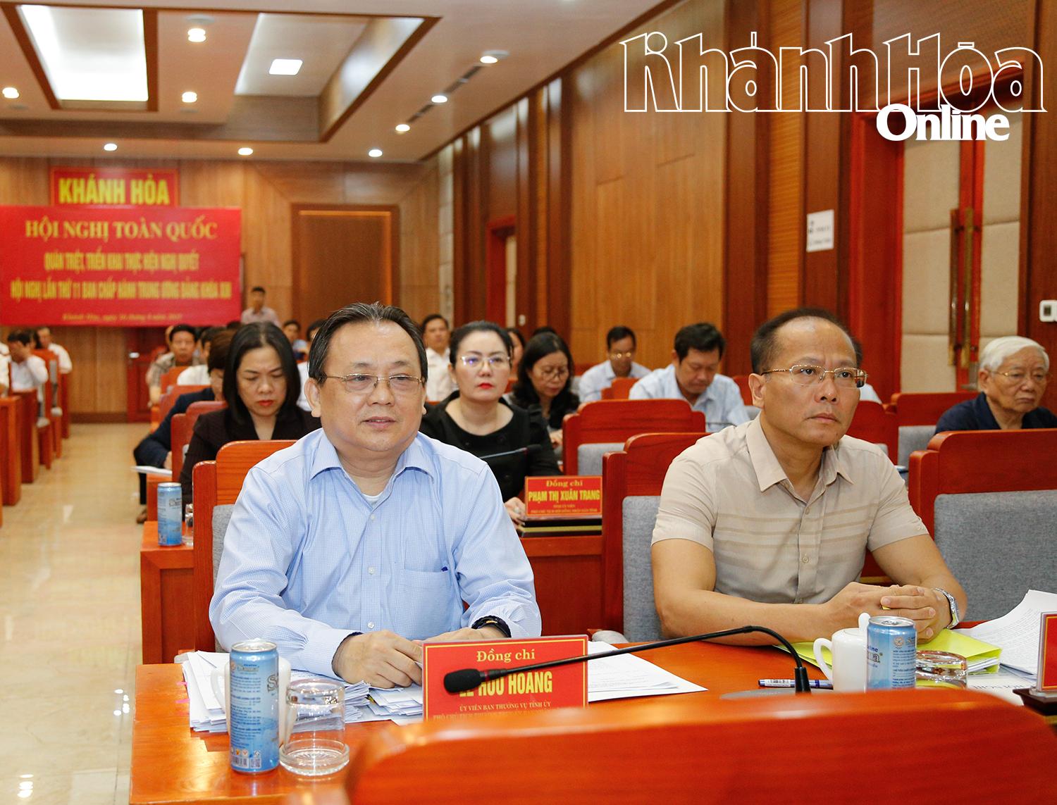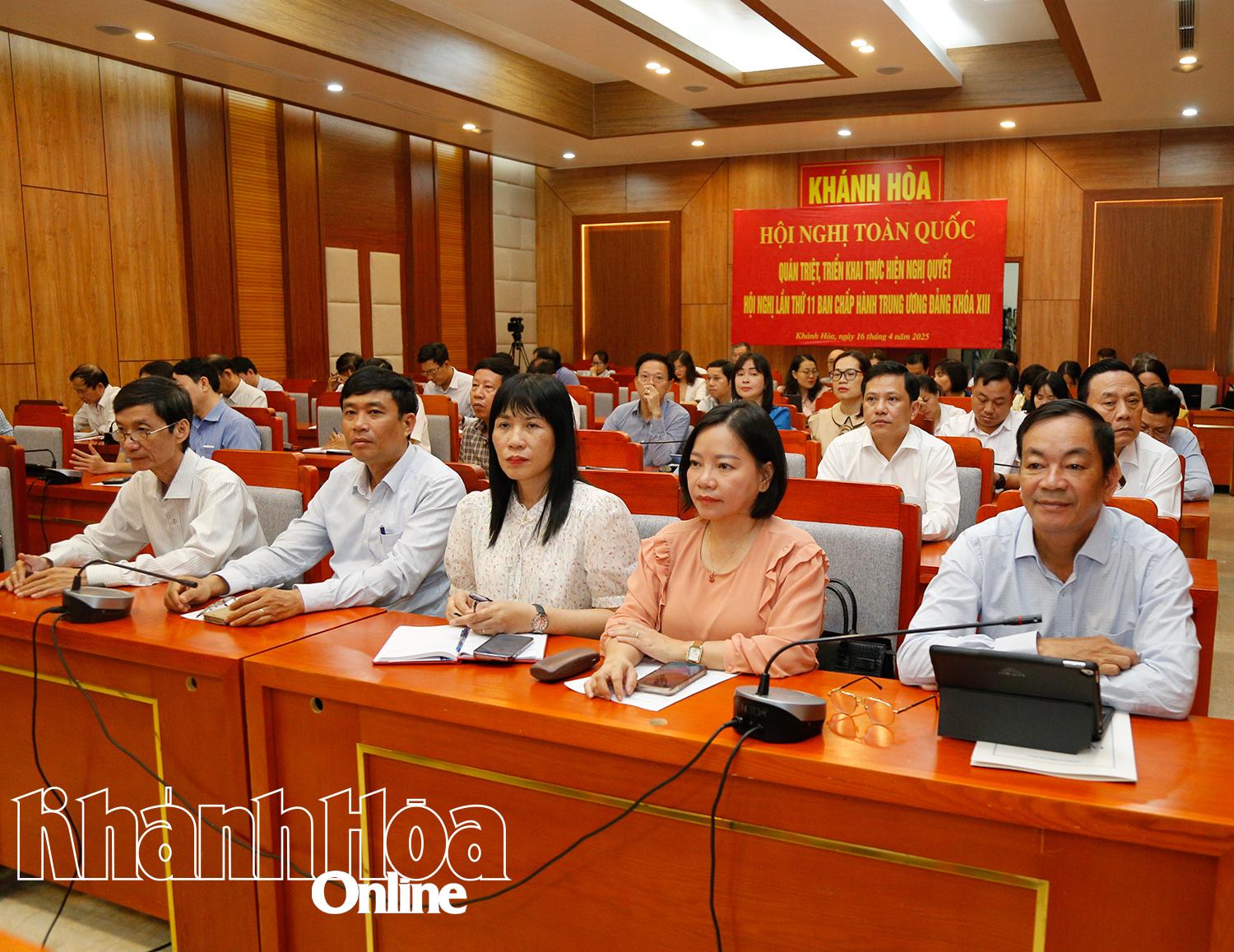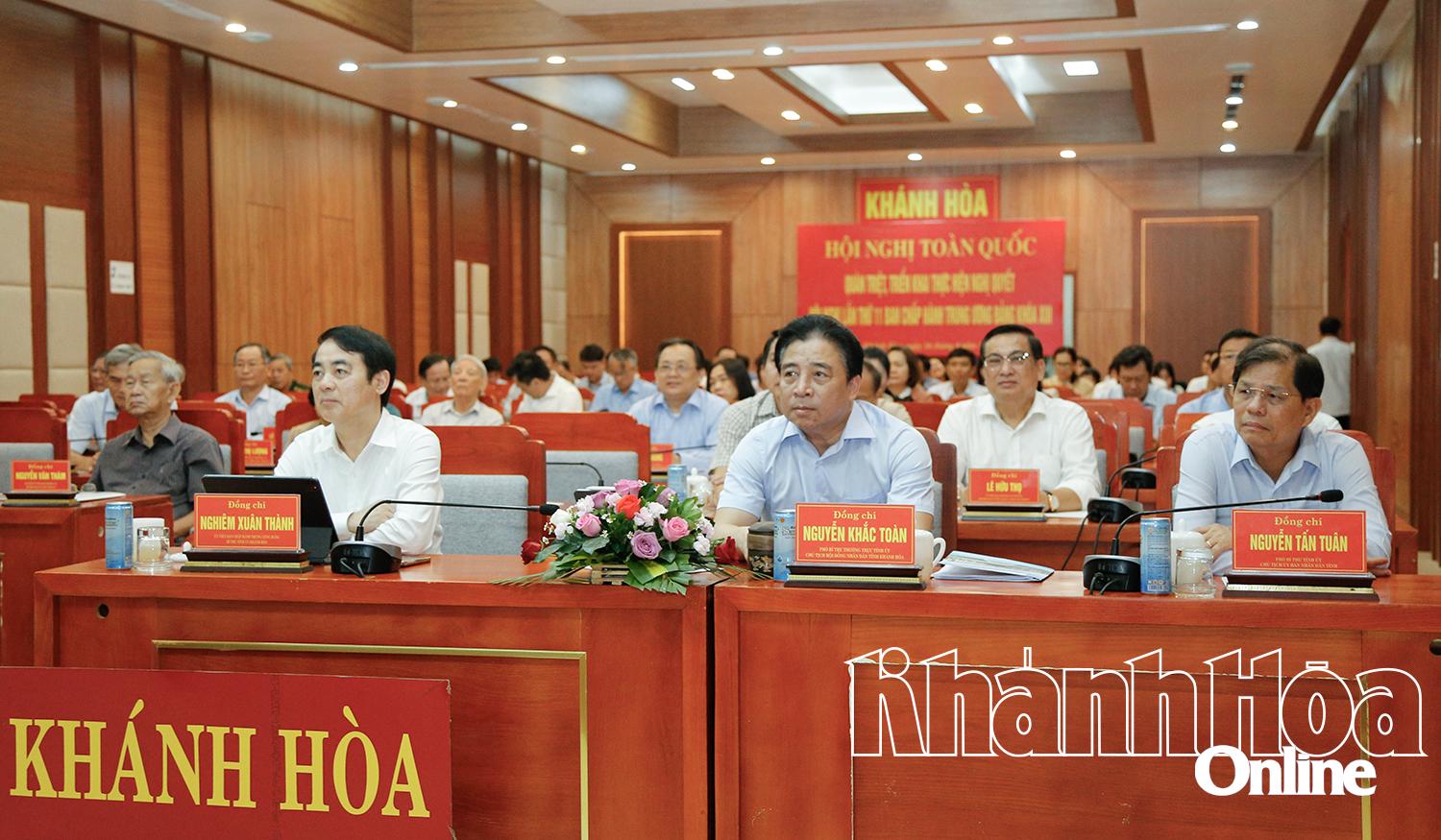 Dự hội nghị tại điểm cầu Tỉnh ủy Khánh Hòa có các ông: Nghiêm Xuân Thành - Ủy viên Trung ương Đảng, Bí thư Tỉnh ủy; Nguyễn Khắc Toàn - Phó Bí thư Thường trực Tỉnh ủy, Chủ tịch HĐND tỉnh, Bí thư Đảng ủy Các cơ quan Đảng tỉnh; Nguyễn Tấn Tuân - Phó Bí thư Tỉnh ủy, Chủ tịch UBND tỉnh, Bí thư Đảng ủy UBND tỉnh; các vị Ủy viên Ban Thường vụ Tỉnh ủy, Thường trực HĐND, UBND, Ủy ban MTTQ Việt Nam tỉnh, các vị nguyên lãnh đạo tỉnh; lãnh đạo các cơ quan tham mưu của Tỉnh ủy; lãnh đạo các sở, ban, ngành, Mặt trận Tổ quốc, các đoàn thể và cơ quan, đơn vị cấp tỉnh…