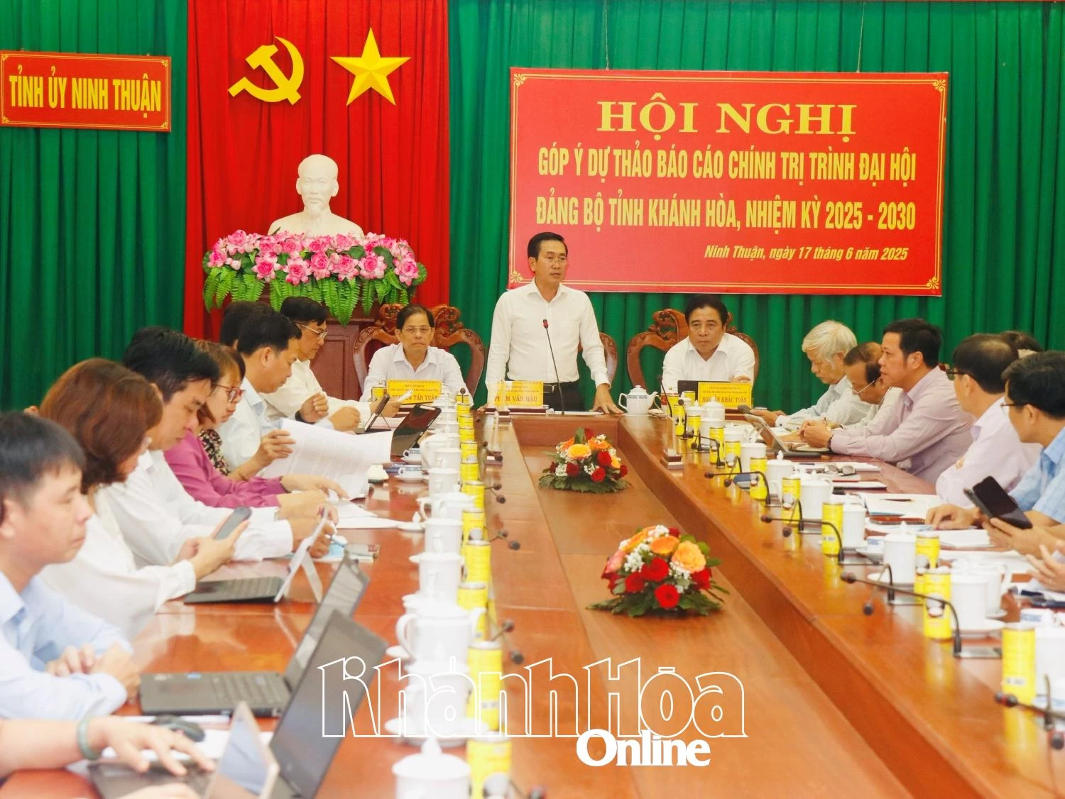 Sáng 17-6, tại TP. Phan Rang - Tháp Chàm (tỉnh Ninh Thuận), Ban Thường vụ Tỉnh ủy 2 tỉnh Ninh Thuận và Khánh Hòa tổ chức Hội nghị lấy ý kiến các chuyên gia, nhà khoa học, trí thức tỉnh Ninh Thuận góp ý dự thảo Báo cáo chính trị trình Đại hội Đảng bộ tỉnh Khánh Hòa lần thứ I, nhiệm kỳ 2025 - 2030. Các ông: Phạm Văn Hậu - Phó Bí thư Thường trực Tỉnh ủy, Chủ tịch HĐND tỉnh, Bí thư Đảng ủy Các cơ quan Đảng tỉnh Ninh Thuận; Nguyễn Khắc Toàn - Phó Bí thư Thường trực Tỉnh ủy, Chủ tịch HĐND tỉnh, Bí thư Đảng ủy Các cơ quan Đảng tỉnh Khánh Hòa; Nguyễn Tấn Tuân - Phó Bí thư Tỉnh ủy, Chủ tịch UBND tỉnh, Bí thư Đảng ủy UBND tỉnh Khánh Hòa chủ trì hội nghị.