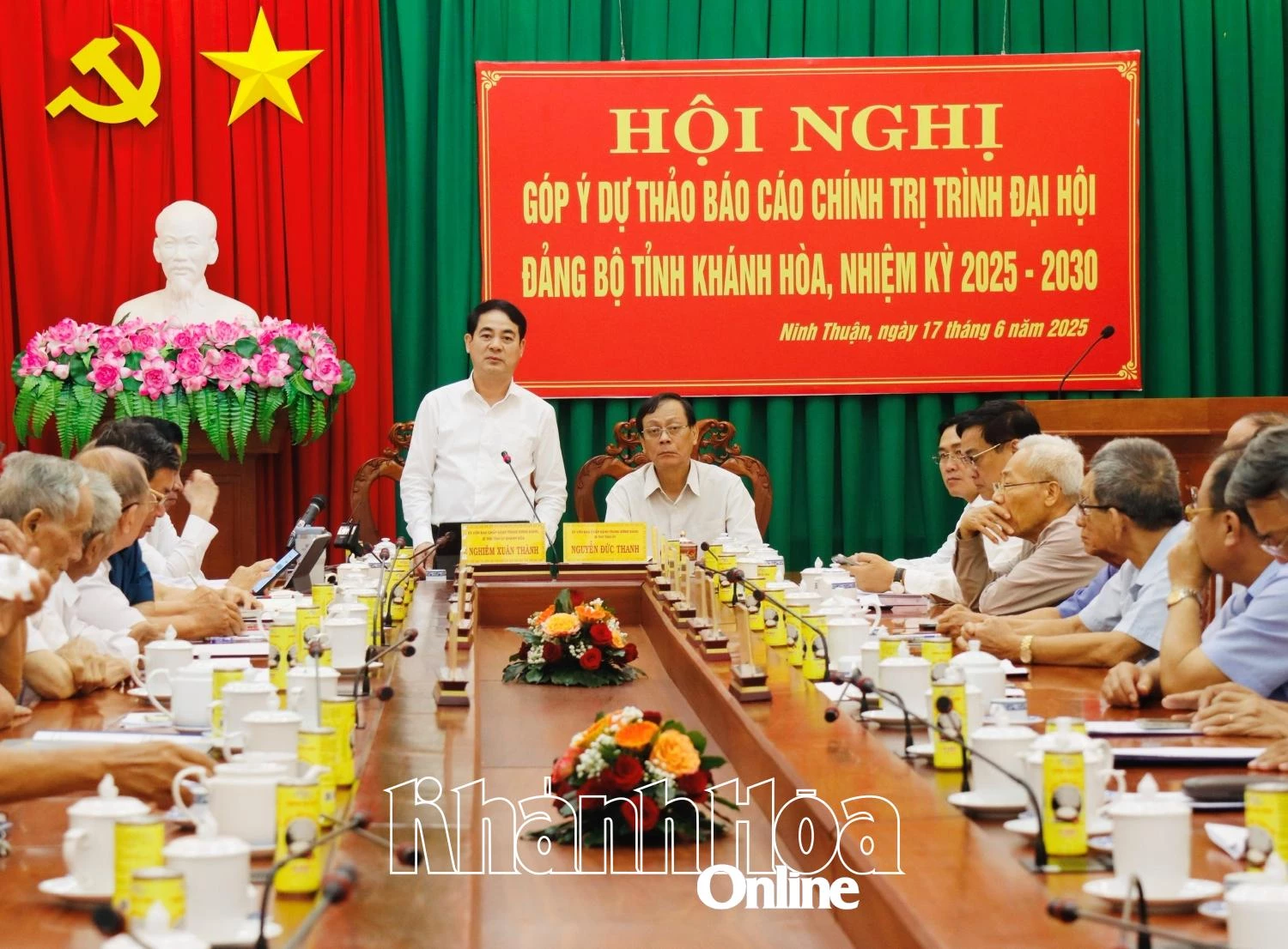 Chiều 17-6, Ban Thường vụ Tỉnh ủy 2 tỉnh Ninh Thuận và Khánh Hòa tổ chức Hội nghị lấy ý kiến cán bộ nguyên lãnh đạo tỉnh Ninh Thuận góp ý vào dự thảo Báo cáo chính trị trình Đại hội Đảng bộ tỉnh Khánh Hòa lần thứ I, nhiệm kỳ 2025 - 2030. Các ông: Nguyễn Đức Thanh - Ủy viên Trung ương Đảng, Bí thư Tỉnh ủy Ninh Thuận; Nghiêm Xuân Thành - Ủy viên Trung ương Đảng, Bí thư Tỉnh ủy Khánh Hòa chủ trì hội nghị. Dự hội nghị có các ông: Phạm Văn Hậu - Phó Bí thư Thường trực Tỉnh ủy, Chủ tịch HĐND tỉnh, Bí thư Đảng ủy Các cơ quan Đảng tỉnh Ninh Thuận; Nguyễn Khắc Toàn - Phó Bí thư Thường trực Tỉnh ủy, Chủ tịch HĐND tỉnh, Bí thư Đảng ủy Các cơ quan Đảng tỉnh Khánh Hòa; Nguyễn Tấn Tuân - Phó Bí thư Tỉnh ủy, Chủ tịch UBND tỉnh, Bí thư Đảng ủy UBND tỉnh Khánh Hòa; các vị nguyên lãnh đạo tỉnh Ninh Thuận.