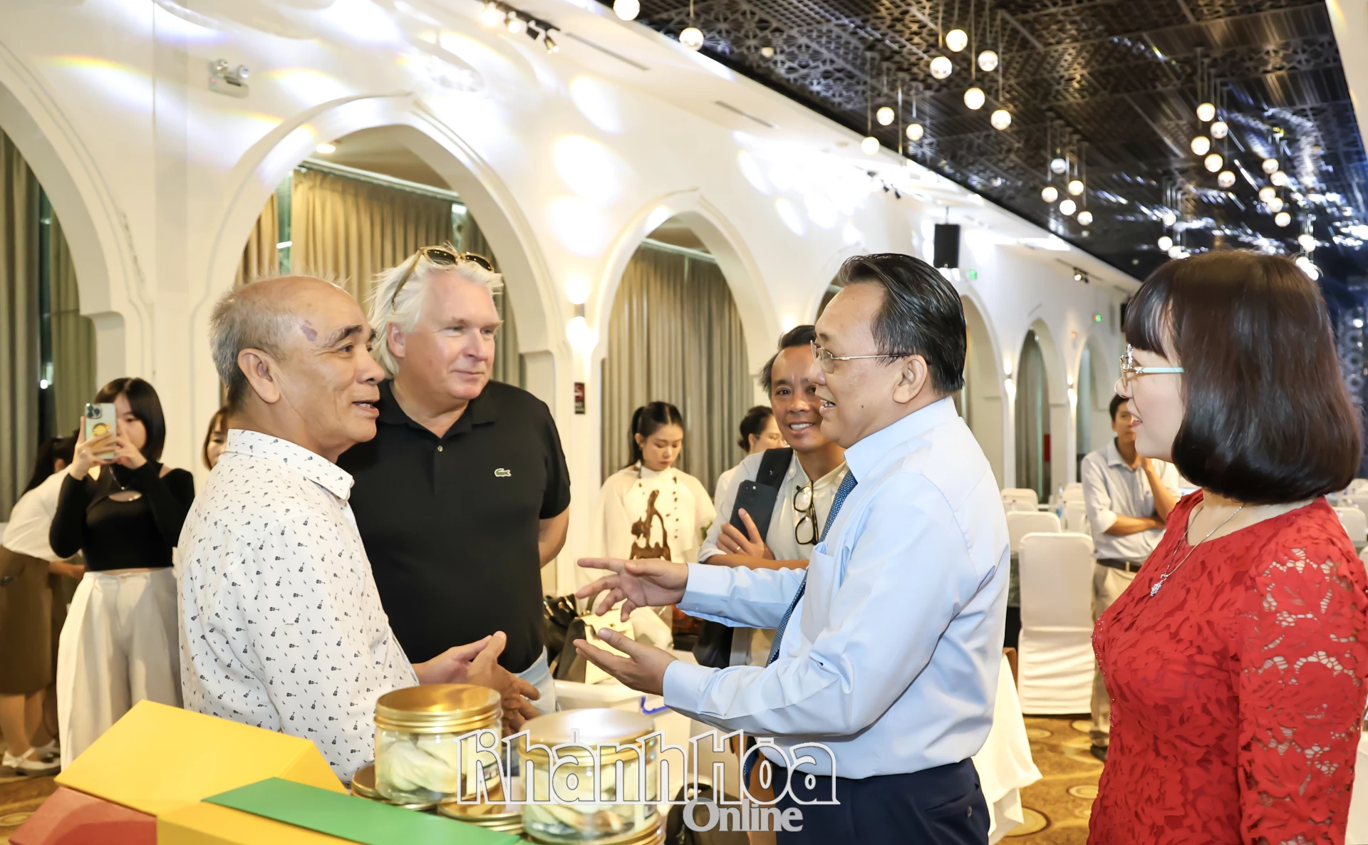 | Phó Chủ tịch Thường trực UBND tỉnh Lê Hữu Hoàng trao đổi với một chủ thể sản phẩm trầm hương đến từ Diên Khánh. |