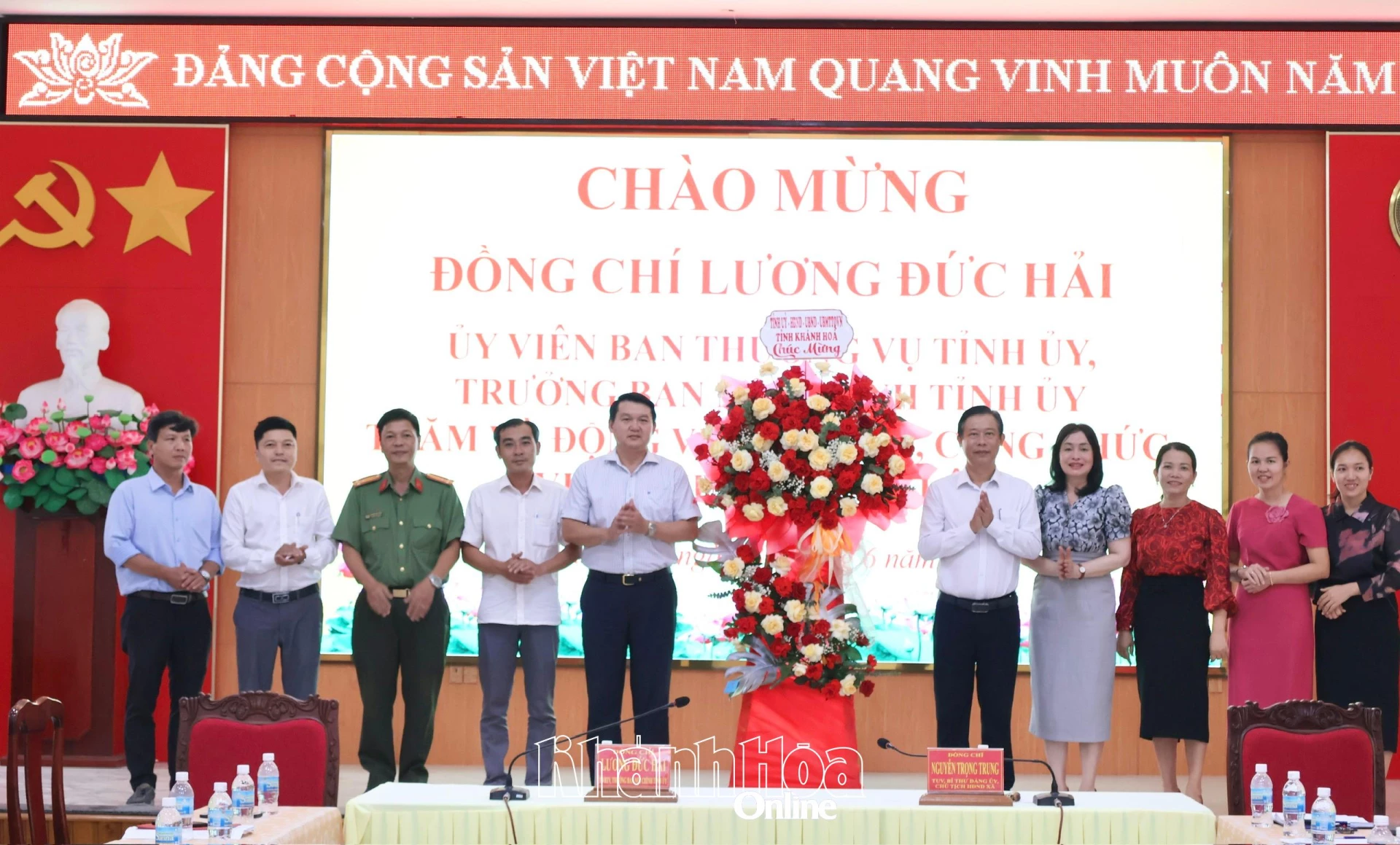 | Trưởng ban Nội chính Tỉnh ủy Lương Đức Hải tặng hoa và gửi lời chúc tới toàn thể cán bộ, công chức, viên chức xã Cam Lâm. |