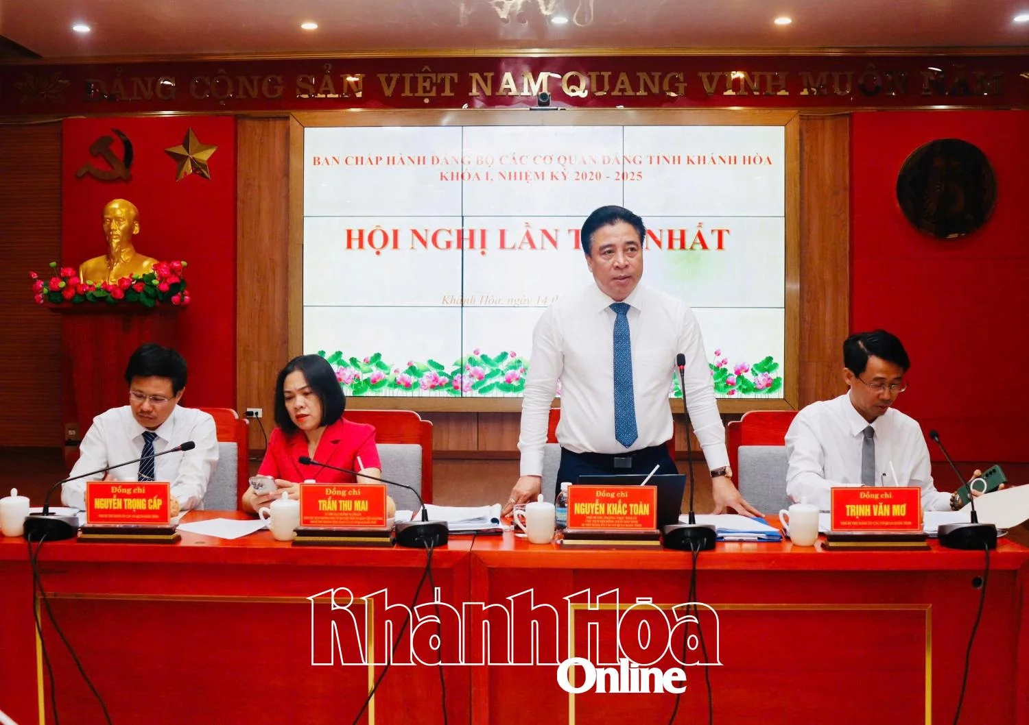 Sáng 14-7, Ban Chấp hành (BCH) Đảng bộ Các cơ quan Đảng tỉnh Khánh Hòa nhiệm kỳ 2020 - 2025 tổ chức Hội nghị lần thứ nhất. Ông Nguyễn Khắc Toàn - Phó Bí thư Thường trực Tỉnh ủy, Chủ tịch HĐND tỉnh, Bí thư Đảng ủy Các cơ quan Đảng tỉnh; bà Trần Thu Mai - Ủy viên Ban Thường vụ Tỉnh ủy, Phó Chủ tịch Thường trực UBMTTQ Việt Nam tỉnh, Phó Bí thư Thường trực Đảng ủy Các cơ quan Đảng tỉnh; ông Trịnh Văn Mơ - Phó Bí thư Đảng ủy Các cơ quan Đảng tỉnh; ông Nguyễn Trọng Cấp - Phó Bí thư Đảng ủy Các cơ quan Đảng tỉnh cùng chủ trì hội nghị. Dự hội nghị có bà Phạm Thị Xuân Trang - Phó Chủ tịch HĐND tỉnh, cùng các Ủy viên Ban Thường vụ, Ủy viên BCH Đảng bộ Các cơ quan Đảng tỉnh.
