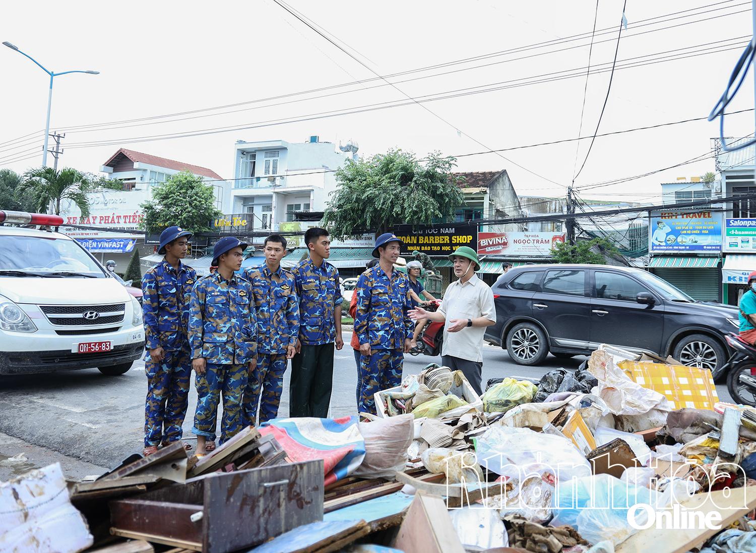 | Đồng chí Nghiêm Xuân Thành động viên bộ đội tham gia dọn vệ sinh môi trường trên đường 23 tháng 10, phường Tây Nha Trang. |