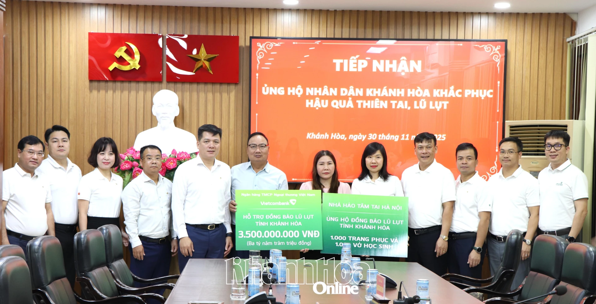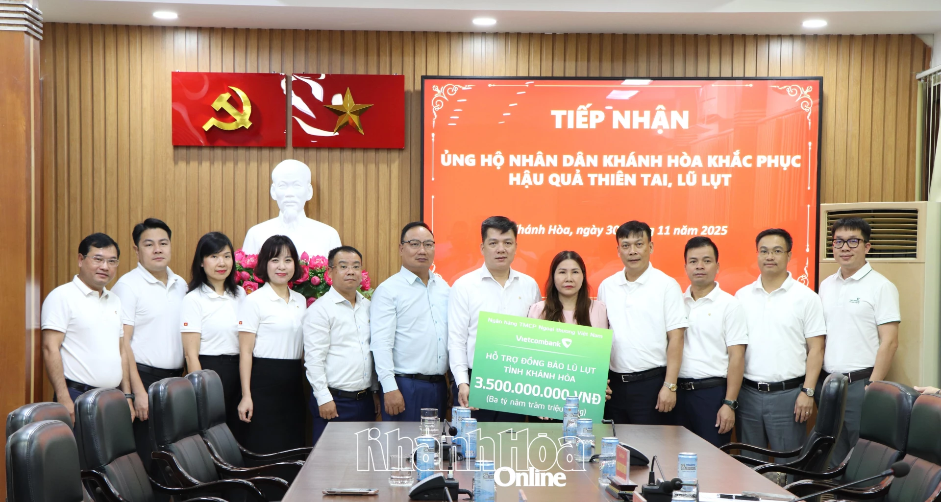 Chiều 30-11, Tỉnh ủy Khánh Hòa tổ chức tiếp nhận kinh phí hỗ trợ từ 13 chi nhánh Ngân hàng TMCP Ngoại thương Việt Nam (Vietcombank) phía Bắc ủng hộ khắc phục hậu quả thiên tai. Dự buổi tiếp nhận có các đồng chí: Nghiêm Xuân Thành - Ủy viên Trung ương Đảng, Bí thư Tỉnh ủy; Hồ Xuân Trường - Phó Bí thư Thường trực Tỉnh ủy; Nguyễn Thanh Hà - Phó Chủ tịch UBND tỉnh Khánh Hòa; lãnh đạo Ủy ban MTTQ Việt Nam tỉnh. Đoàn công tác Vietcombank do ông Hồ Văn Tuấn - Phó Tổng Giám đốc Vietcombank làm trưởng đoàn.