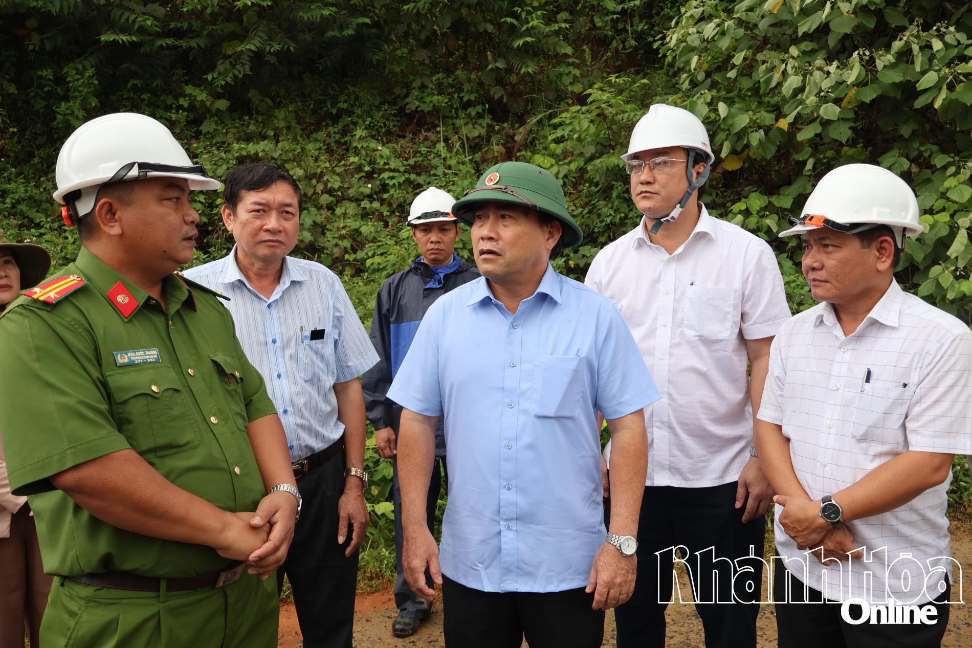 | Phó Bí thư Tỉnh ủy Lâm Đông nghe báo cáo và chỉ đạo tại khu vực điểm sạt lở xã Khánh Sơn. |