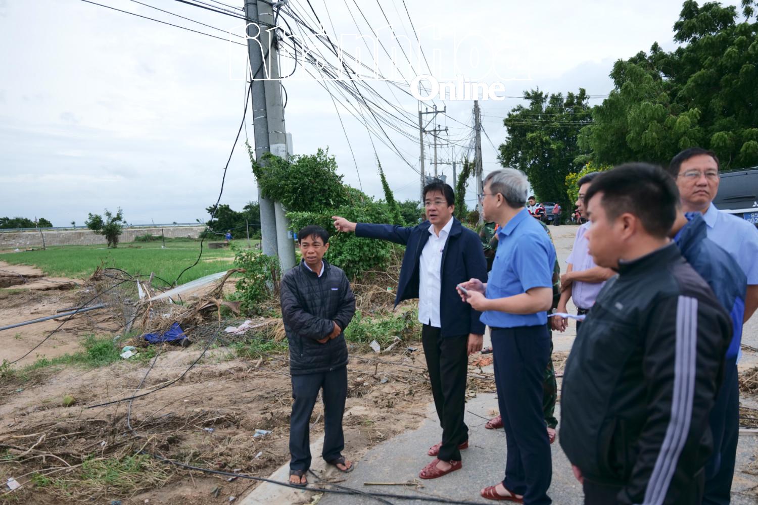 | Phó Chủ tịch Thường trực UBND tỉnh Nguyễn Long Biên kiểm tra các điểm sạt lở ở xã Ninh Hải. |