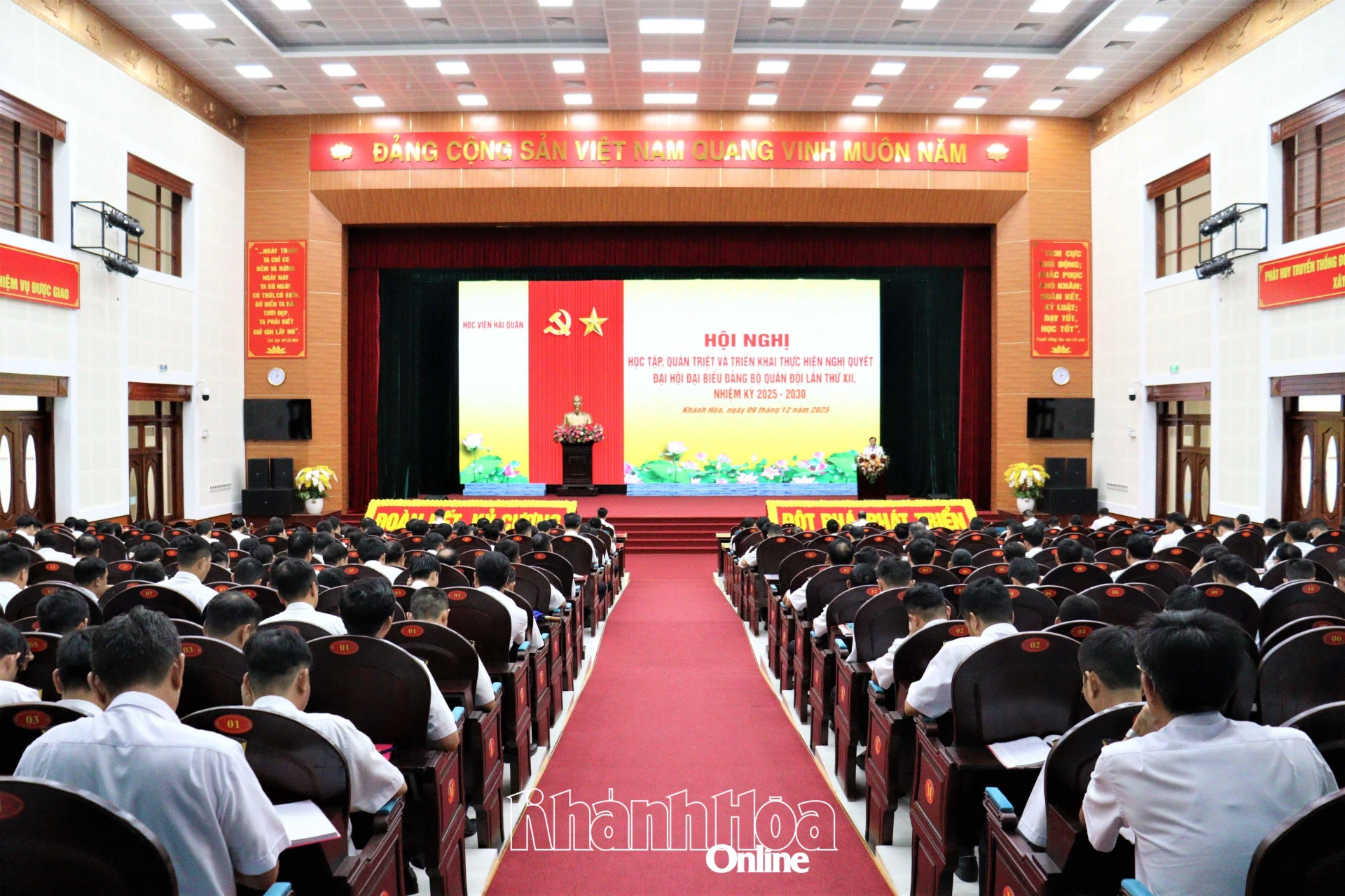 Trên cơ sở quán triệt, nắm chắc các nội dung cơ bản, cốt lõi, điểm mới và tinh thần chỉ đạo của Nghị quyết Đại hội đại biểu Đảng bộ Quân đội lần thứ XII, Chương trình hành động thực hiện nghị quyết đại hội Đảng các cấp, Chính ủy Học viện Hải quân yêu cầu cấp ủy, chỉ huy các cơ quan, khoa, đơn vị và cán bộ, sĩ quan trong toàn học viện thống nhất cao về tư tưởng và hành động, xác định tốt quyết tâm chính trị, ý thức, trách nhiệm trong học tập và công tác, củng cố niềm tin, phát huy bản lĩnh chính trị, quyết tâm thực hiện thắng lợi mục tiêu, nhiệm vụ đại hội đề ra, cụ thể hóa triển khai thực hiện nghị quyết, chương trình hành động các cấp vào thực tiễn giảng dạy, học tập, phấn đấu hoàn thành tốt mọi nhiệm vụ.