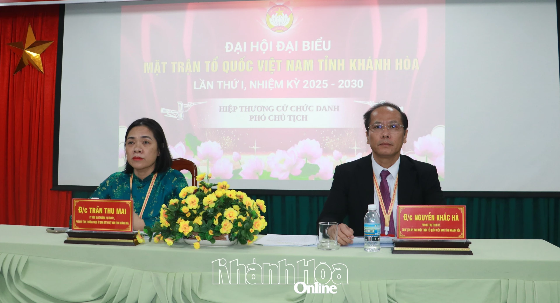 Với chủ đề “Đoàn kết - Dân chủ - Đổi mới - Đột phá - Phát triển”, tại phiên làm việc thứ nhất, đại hội đã tiến hành hiệp thương cử đoàn chủ tịch gồm 10 vị và thư ký đại hội gồm 2 vị; thông qua chương trình, nội quy đại hội. Đồng thời, báo cáo kiểm điểm hoạt động của Ủy ban và Ban Thường trực Ủy ban MTTQ Việt Nam tỉnh nhiệm kỳ 2024 - 2029. Theo đó, trong hơn một năm thực hiện Nghị quyết Đại hội MTTQ Việt Nam tỉnh, Ủy ban MTTQ Việt Nam tỉnh Khánh Hòa và tỉnh Ninh Thuận (trước khi hợp nhất) đã phát huy tinh thần đoàn kết, thống nhất và chủ động cụ thể hóa chương trình hành động sát với tình hình thực tiễn; tập trung triển khai các nhiệm vụ trọng tâm, nâng cao chất lượng hoạt động của Mặt trận các cấp và tổ chức thành viên; củng cố khối đại đoàn kết toàn dân; hướng mạnh các hoạt động về cơ sở. Các cuộc vận động, phong trào thi đua yêu nước tiếp tục lan tỏa; công tác giám sát, phản biện xã hội được tăng cường, góp phần phát huy quyền làm chủ của Nhân dân và xây dựng hệ thống chính trị vững mạnh. Mặt trận các cấp cũng chú trọng đổi mới nội dung, phương thức hoạt động theo hướng thiết thực, hiệu quả. Đặc biệt, sau khi sắp xếp, hợp nhất tổ chức bộ máy gắn với mô hình chính quyền hai cấp, Ủy ban MTTQ Việt Nam tỉnh Khánh Hòa nhanh chóng ổn định tổ chức, ban hành Quy chế hoạt động phù hợp và triển khai kịp thời các nhiệm vụ trong giai đoạn mới.