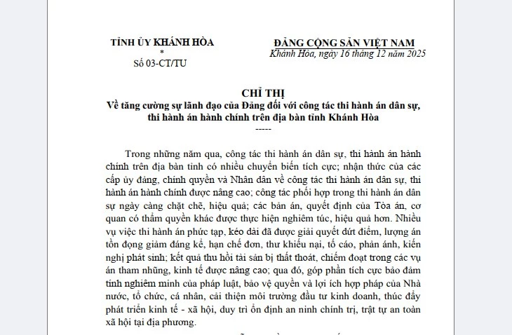 Ban Thường vụ Tỉnh ủy Khánh Hòa vừa ban hành Chỉ thị về tăng cường sự lãnh đạo của Đảng đối với công tác thi hành án dân sự, thi hành án hành chính trên địa bàn tỉnh.