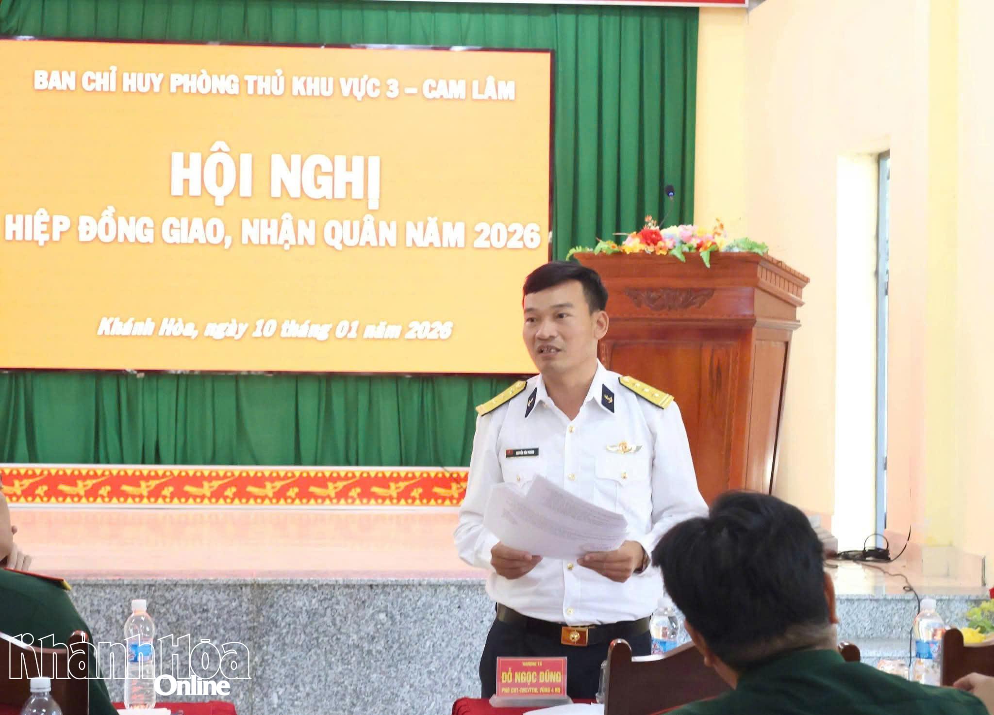 Ngày 10-1, Ban Chỉ huy Phòng thủ khu vực 3 - Cam Lâm tổ chức hội nghị hiệp đồng giao, nhận quân năm 2026. Dự hội nghị có đại diện chỉ huy các đơn vị nhận quân gồm: Trung đoàn 591, Sư đoàn Phòng không 377; Lữ đoàn 957, Vùng 4 Hải quân; Trung tâm Huấn luyện, Vùng 4 Hải quân; Lữ đoàn Công binh 293; Lữ đoàn Đặc công nước 5; Ban Chỉ huy Bộ đội Biên phòng tỉnh; Tiểu đoàn Công binh 17, Sư đoàn Bộ binh 2; Tiểu đoàn 674, Bộ Tham mưu Quân khu 5; Tiểu đoàn 610, Trung đoàn Bộ binh 896, Bộ Chỉ huy Quân sự tỉnh; Công an tỉnh.