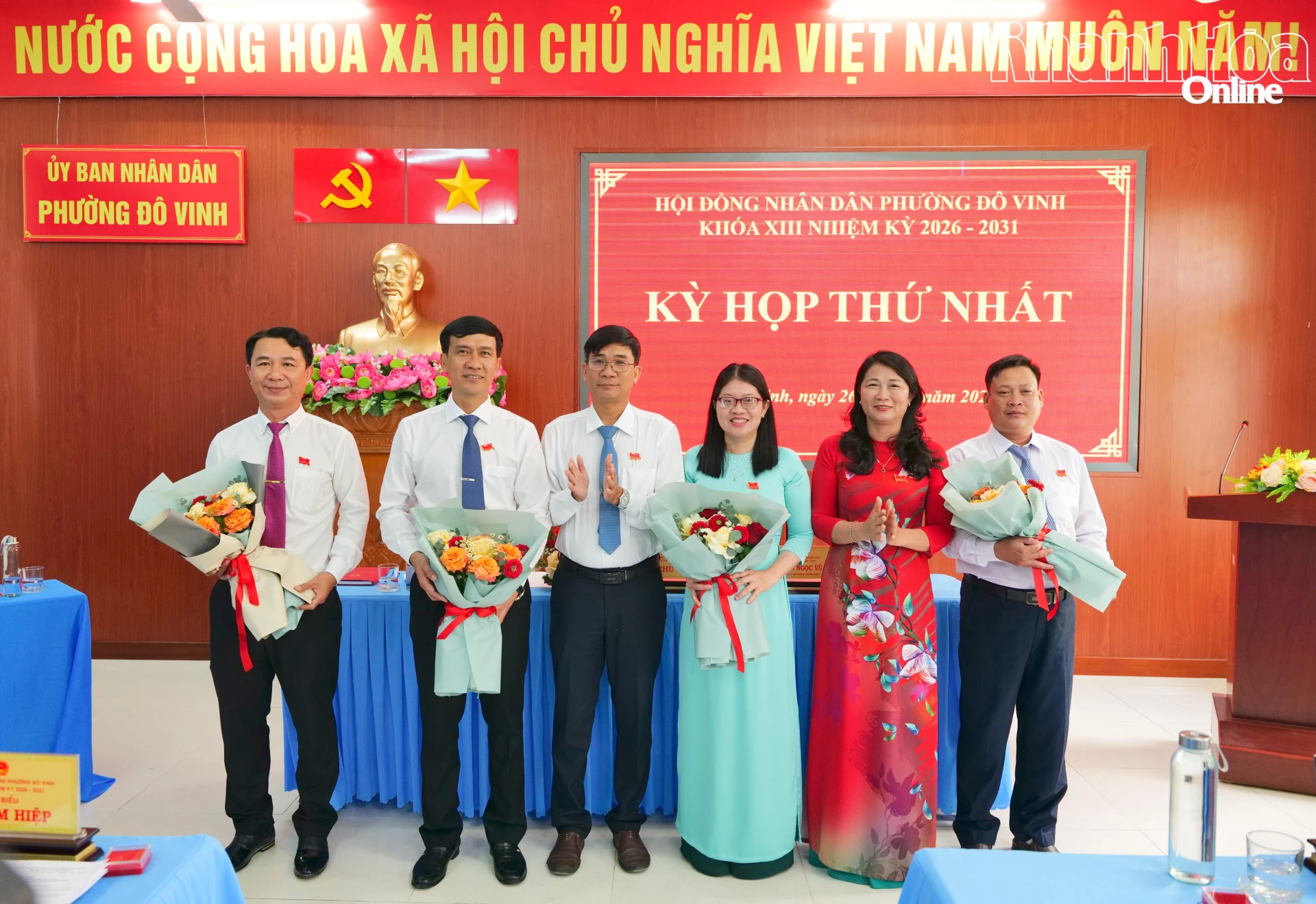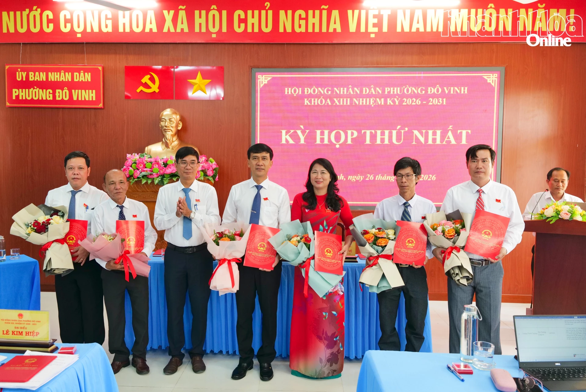 | Các đồng chí được bầu giữ các chức danh chủ chốt HĐND phường Đô Vinh khóa XIII, nhiệm kỳ 2026 - 2031 ra mắt tại kỳ họp thứ nhất. |
