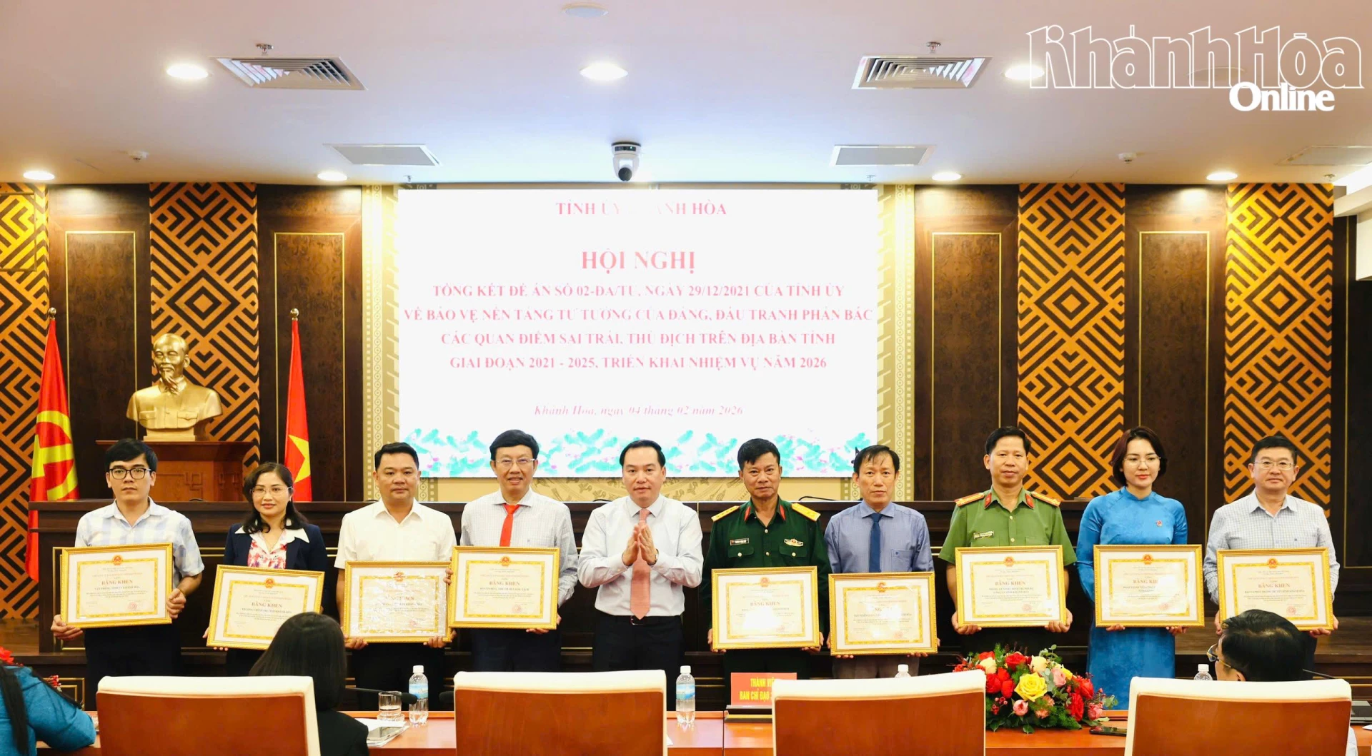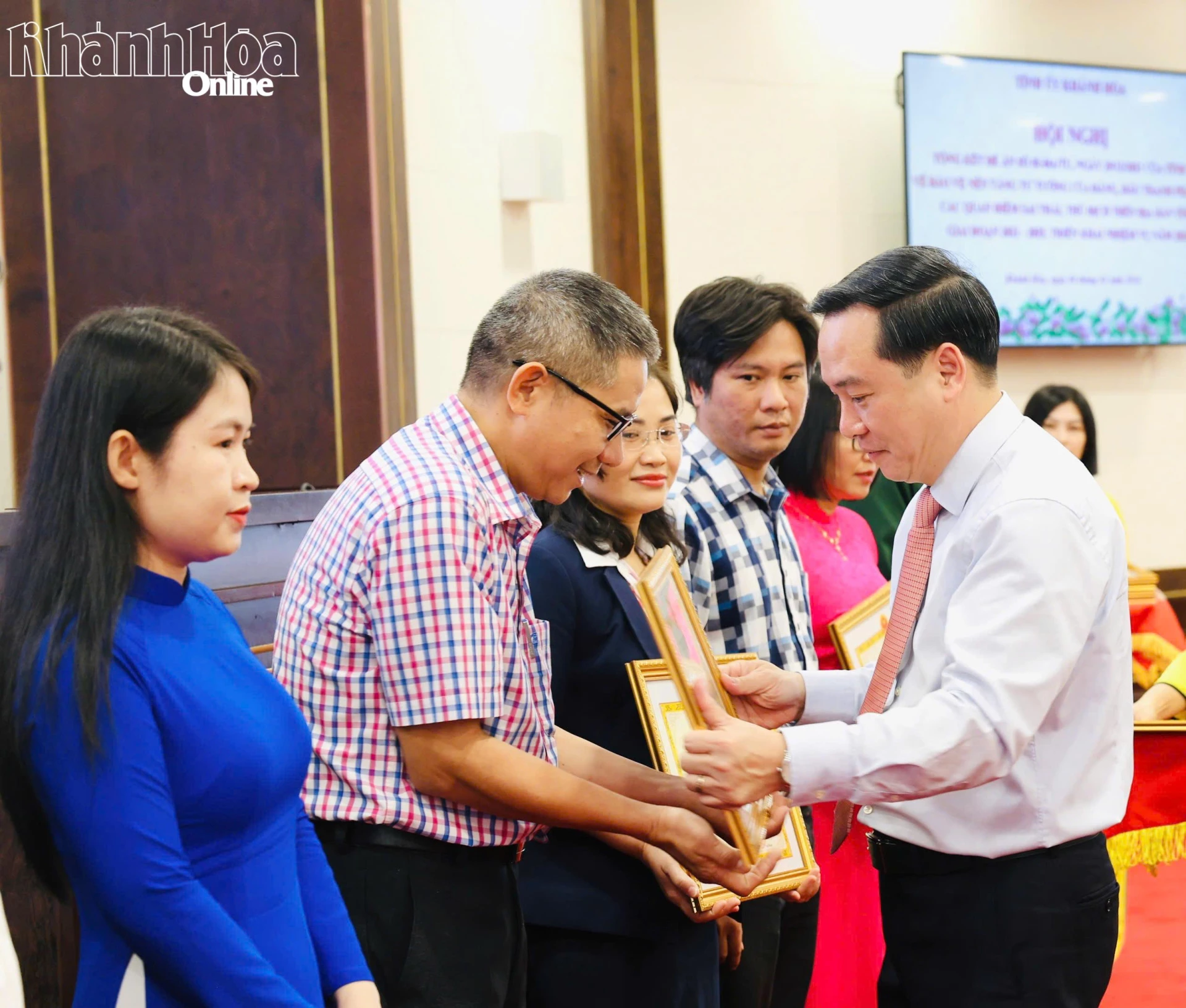 Tại hội nghị, Phó Bí thư Thường trực Tỉnh ủy Hồ Xuân Trường đã trao bằng khen của Chủ tịch UBND tỉnh cho 10 tập thể và 13 cá nhân đã có thành tích xuất sắc trong triển khai thực hiện Đề án số 02 của Tỉnh ủy về bảo vệ nền tảng tư tưởng của Đảng, đấu tranh phản bác các quan điểm sai trái, thù địch giai đoạn 2021 - 2025.
