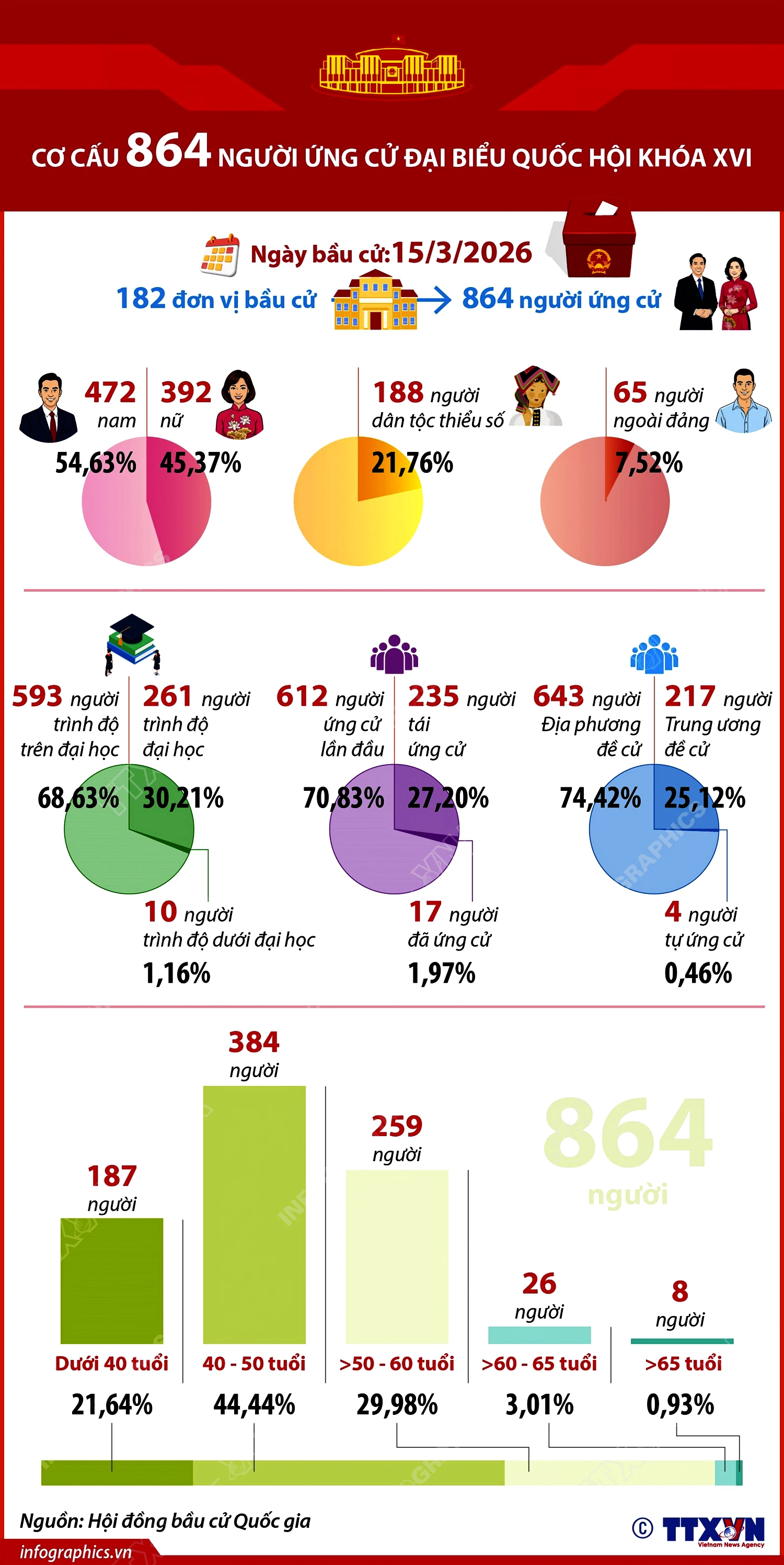 Theo đó, Hội đồng bầu cử quốc gia quyết nghị công bố danh sách 864 người ứng cử đại biểu Quốc hội khóa XVI tại 182 đơn vị bầu cử trong cả nước để bầu 500 đại biểu Quốc hội khóa XVI. Trong số 864 người, có 392 người là nữ, chiếm 45,37%; 188 người dân tộc thiểu số, chiếm 21,76%; 65 người ngoài đảng, chiếm tỷ lệ 7,52%...