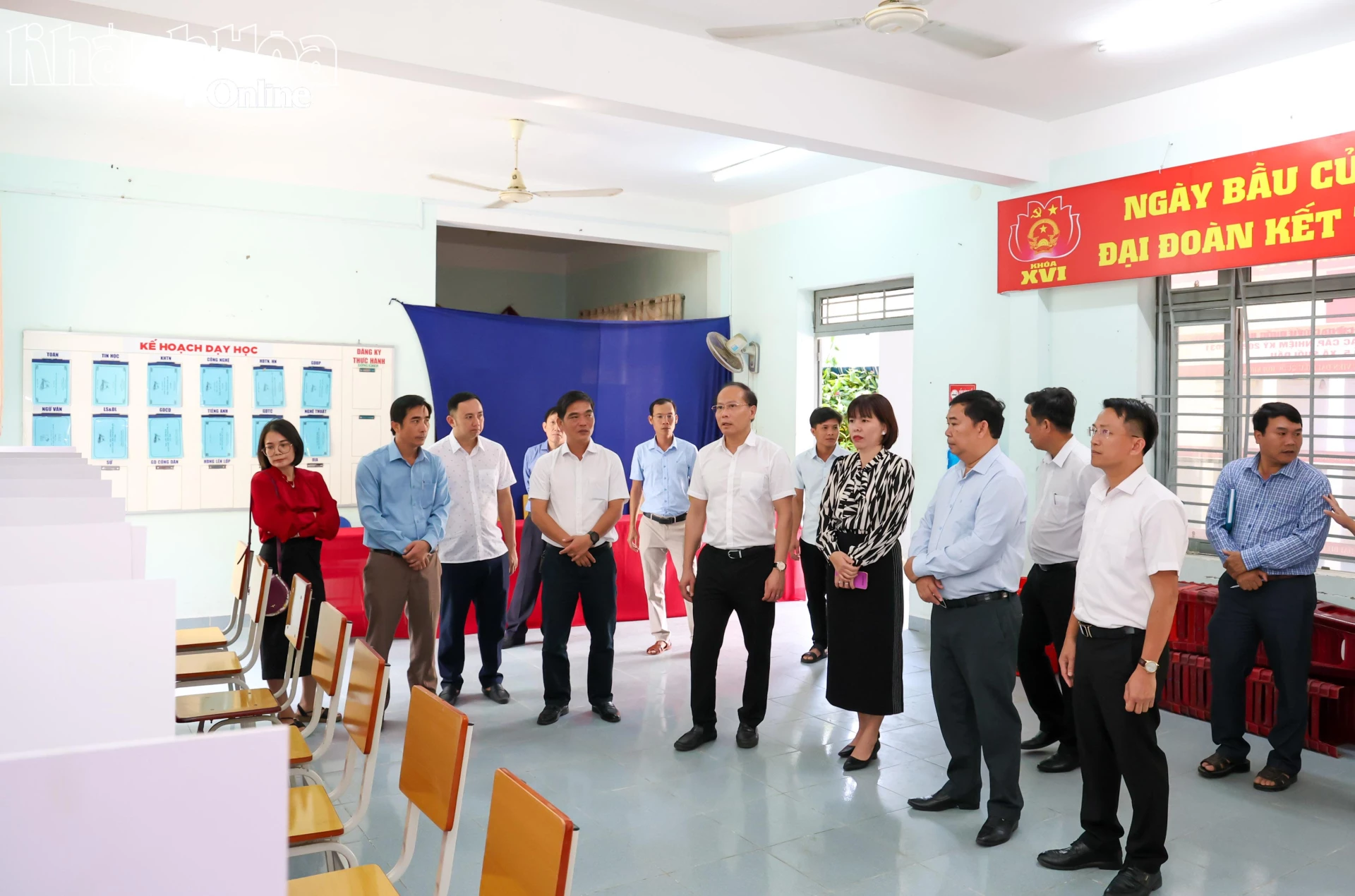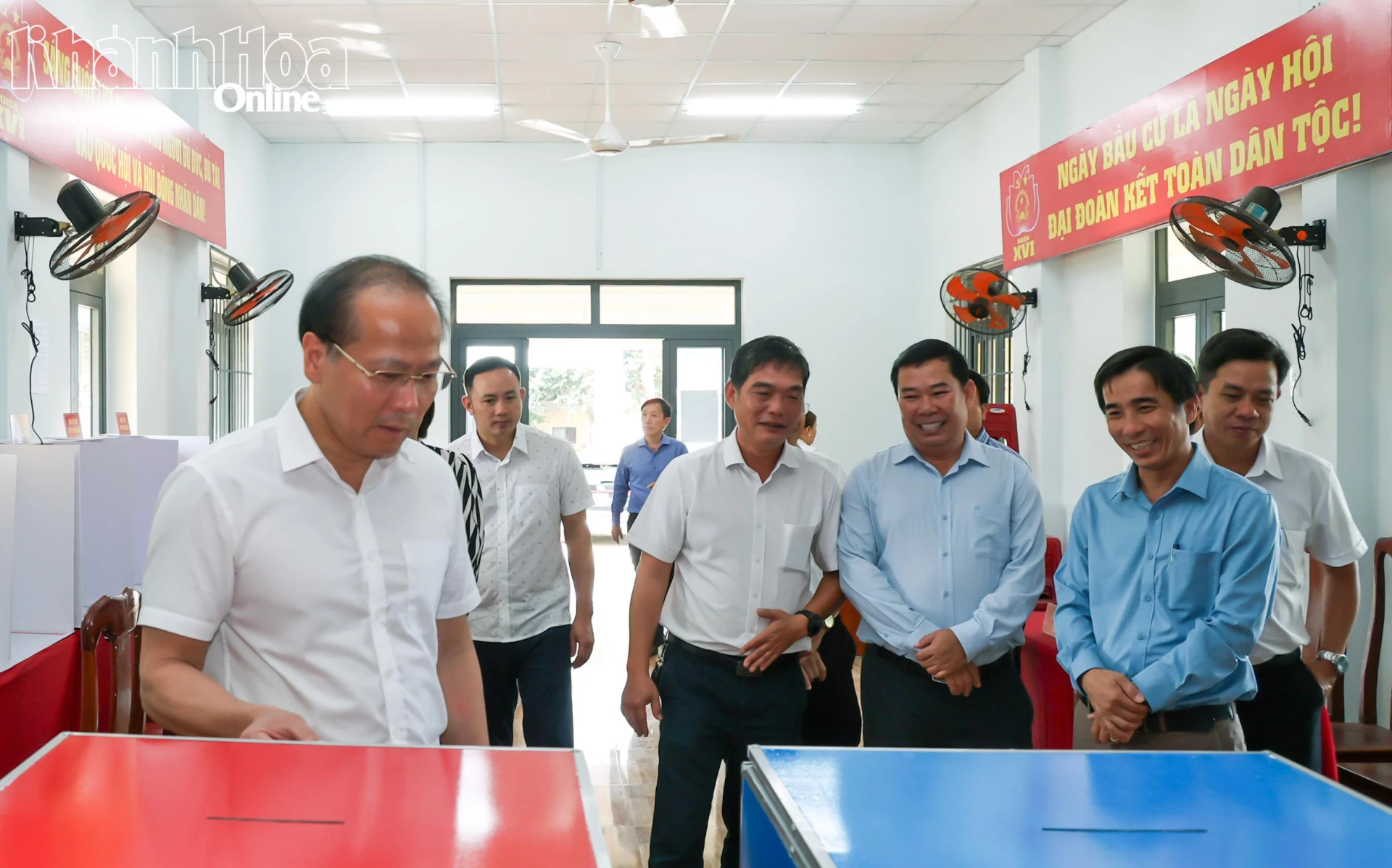 | Đồng chí Nguyễn Khắc Hà kiểm tra việc bố trí các hòm phiếu tại khu vực bỏ phiếu ở xã Suối Dầu. |