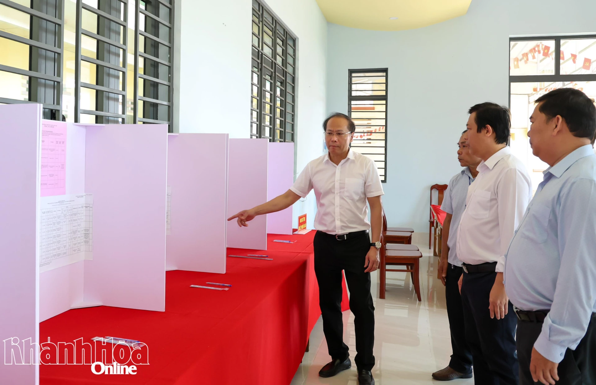 | Đồng chí Nguyễn Khắc Hà kiểm tra việc bố trí các hòm phiếu tại khu vực bỏ phiếu ở xã Cam Lâm. |