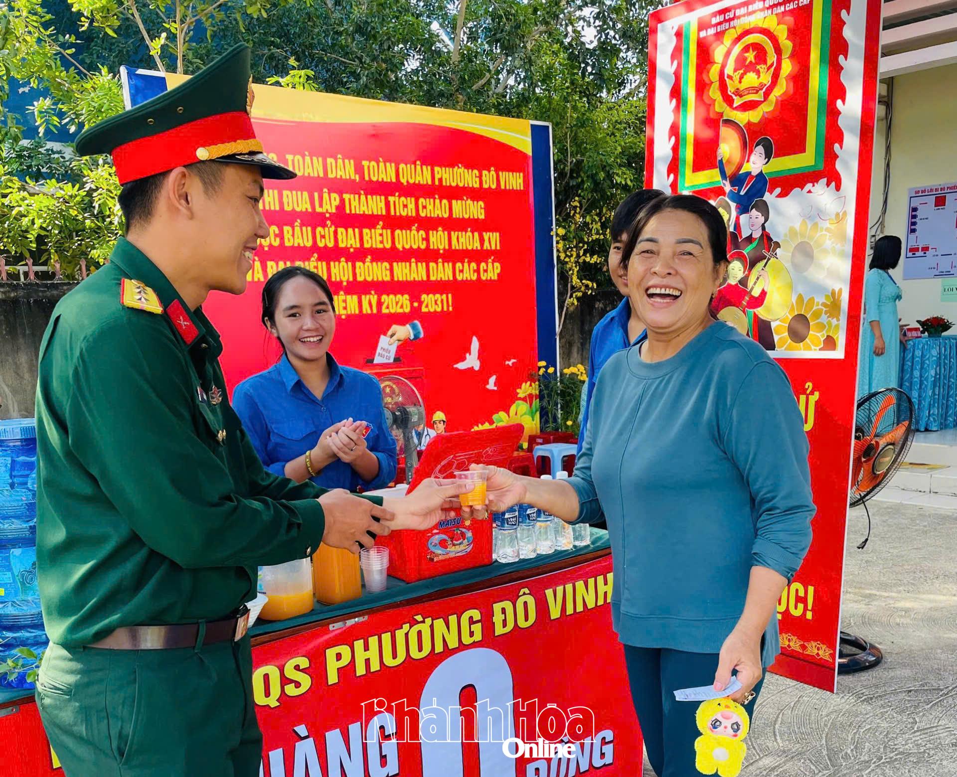 Tại các khu vực bỏ phiếu nói trên, các lực lượng của phường Đô Vinh đã phục vụ trái cây, bánh, nước miễn phí cho cử tri đi bầu cử. Hoạt động thiết thực, ý nghĩa này không chỉ tạo sự thân thiện, gần gũi, tiếp thêm năng lượng cho cử tri đến thực hiện quyền và nghĩa vụ công dân, mà còn tạo không khí vui tươi, phấn khởi, góp phần vào thành công chung của cuộc bầu cử đại biểu Quốc hội khóa XVI và đại biểu HĐND các cấp nhiệm kỳ 2026 - 2031.