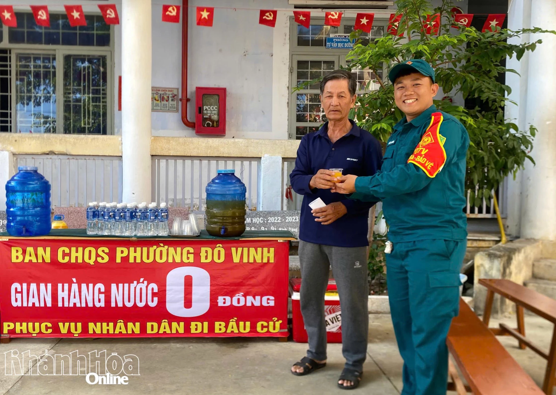 | Gian hàng nước 0 đồng phục vụ cử tri đi bầu cử của Ban Chỉ huy Quân sự phường Đô Vinh. |