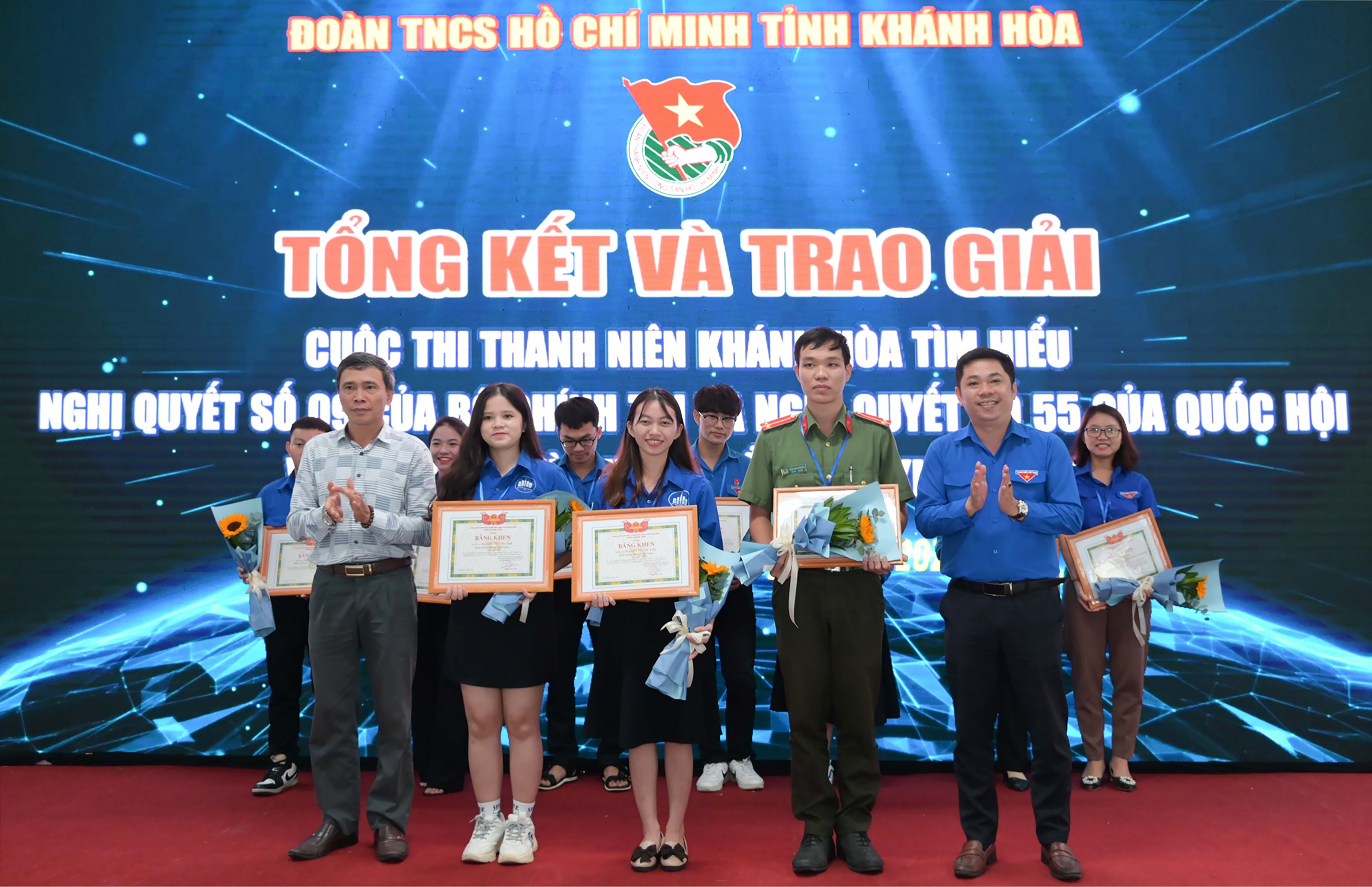 | Em Nguyễn Thị Vân Anh (hàng đầu, thứ 2 từ trái qua) nhận giải nhì cuộc thi Thanh niên Khánh Hòa tìm hiểu Nghị quyết số 09 và Nghị quyết số 55. |