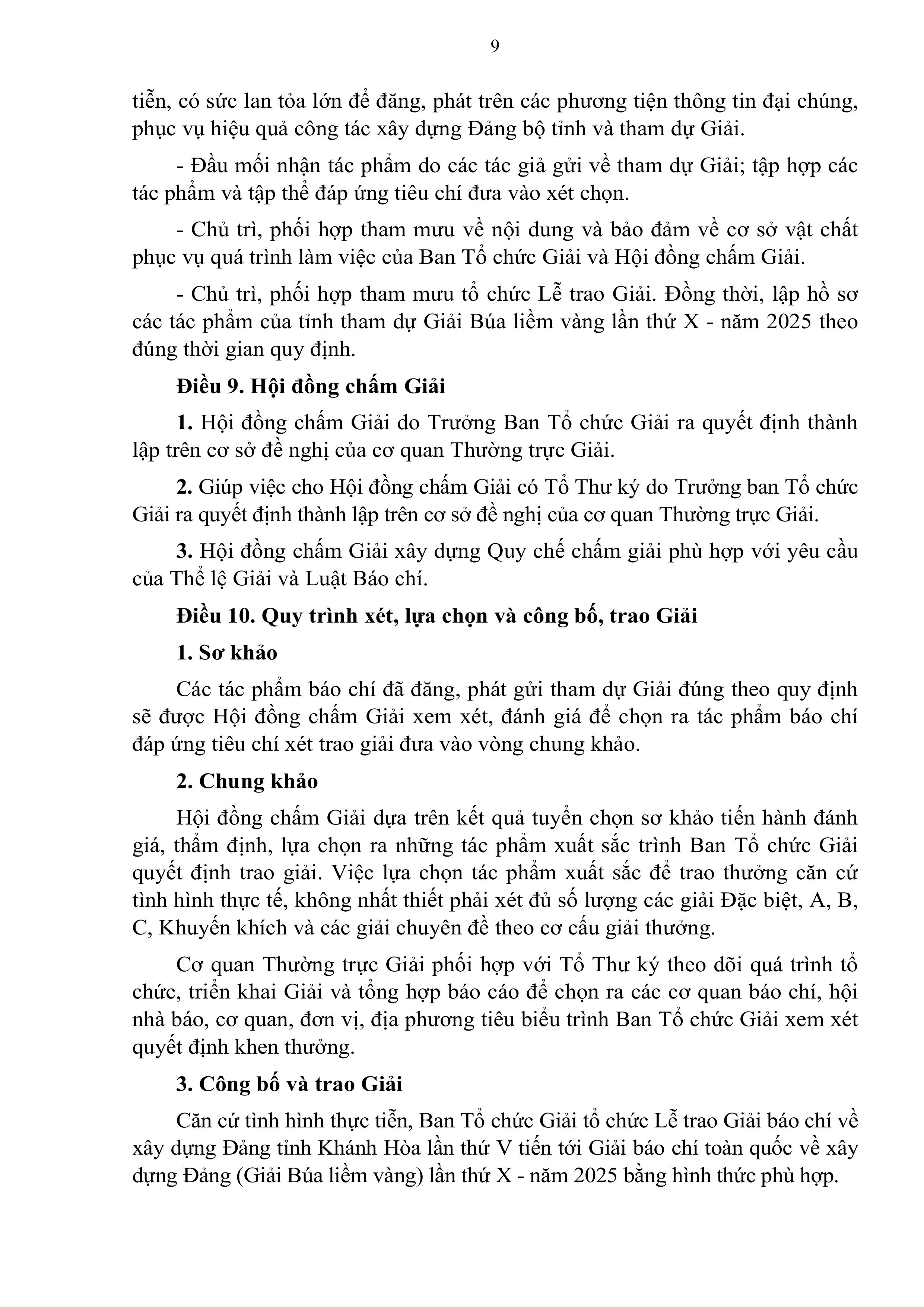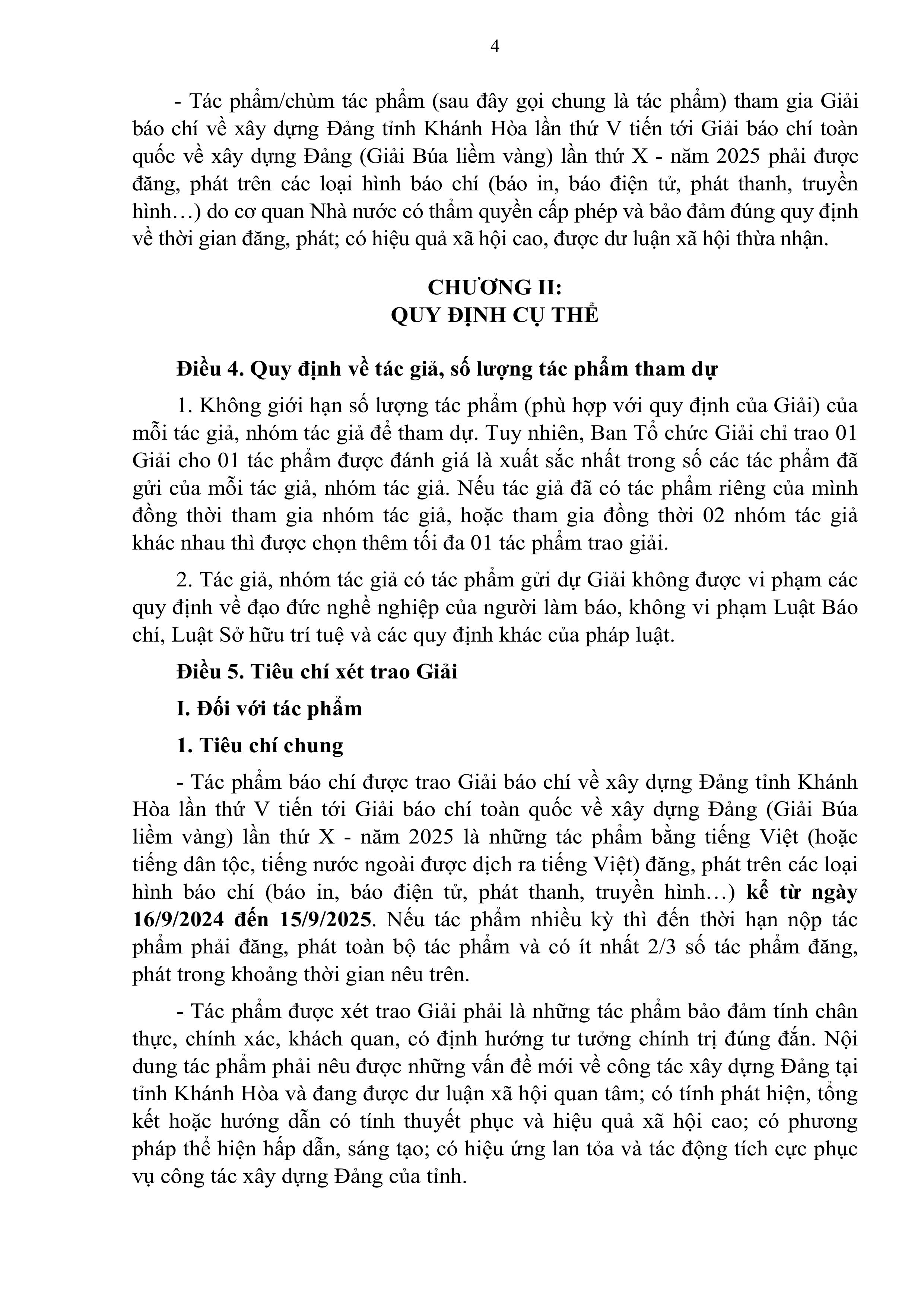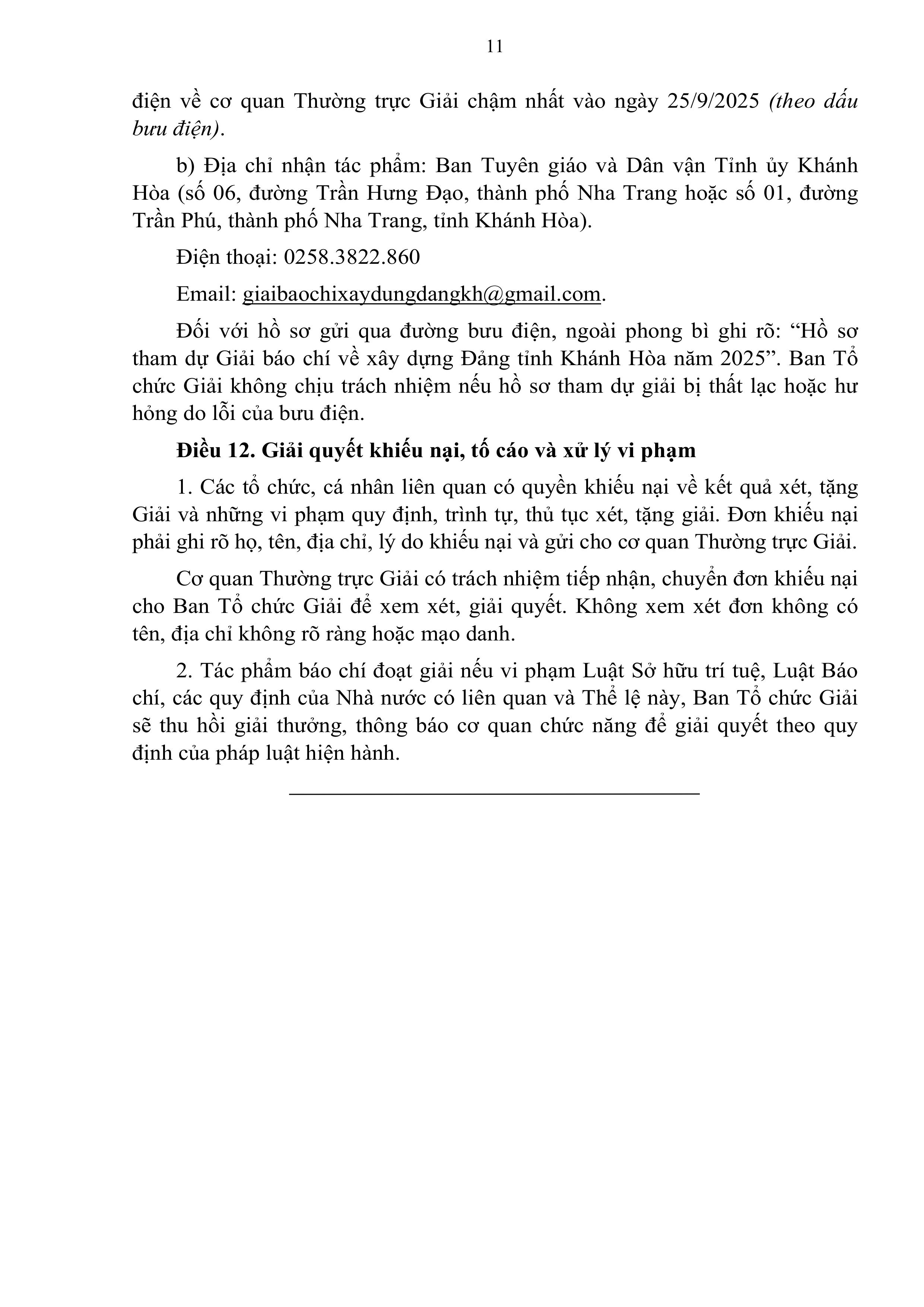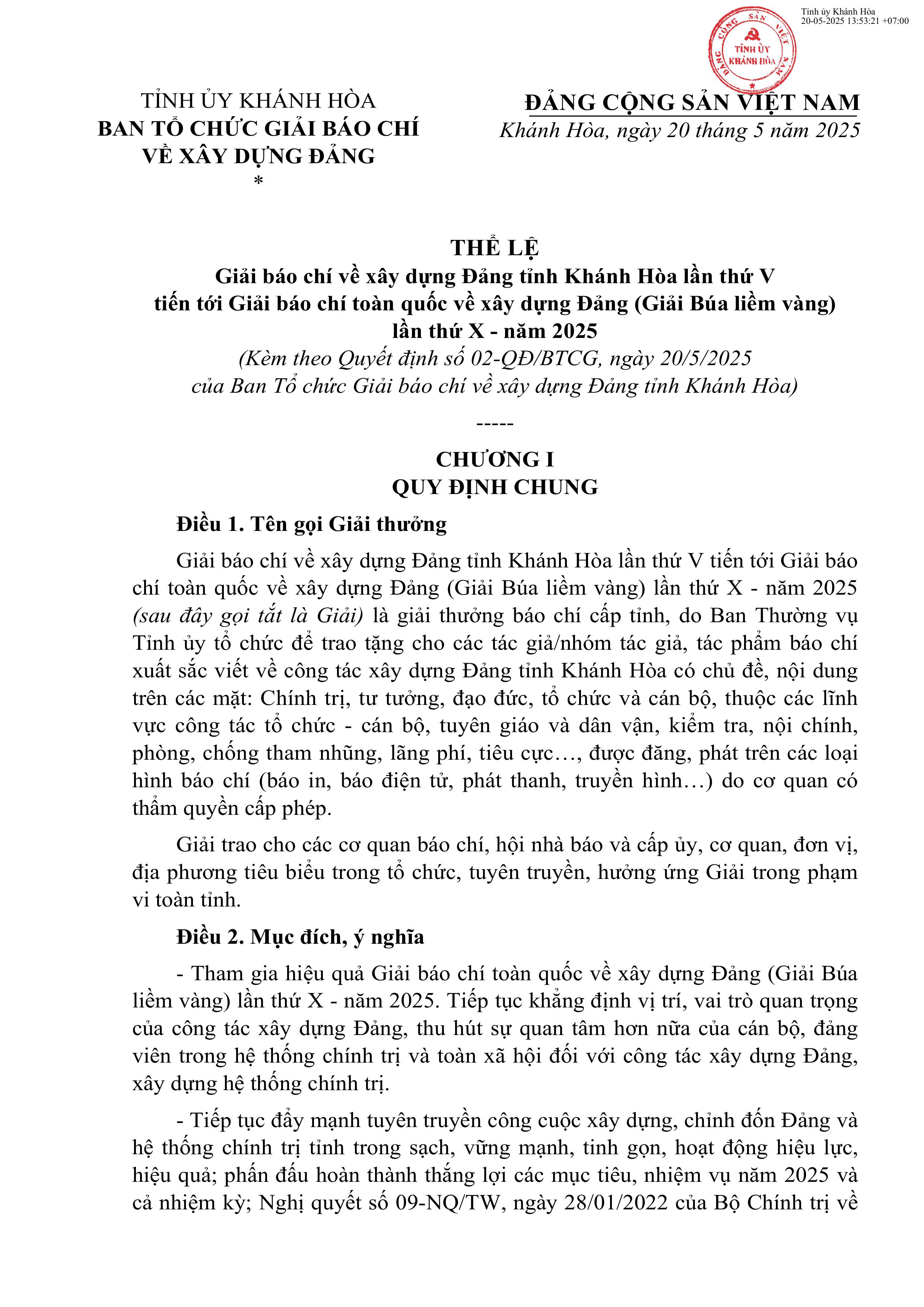 Thực hiện Kế hoạch số 269-KH/TU, ngày 31-3-2025 của Ban Thường vụ Tỉnh ủy tổ chức Giải báo chí về xây dựng Đảng tỉnh Khánh Hòa lần thứ V tiến tới Giải báo chí toàn quốc về xây dựng Đảng (Giải Búa liềm vàng) lần thứ X - năm 2025, Ban tổ chức Giải báo chí về xây dựng Đảng tỉnh đã ban hành Quyết định số 02, ngày 20-5-2025 về Thể lệ Giải báo chí về xây dựng Đảng tỉnh Khánh Hòa lần thứ V - năm 2025. Báo Khánh Hòa trân trọng giới thiệu nội dung thể lệ.