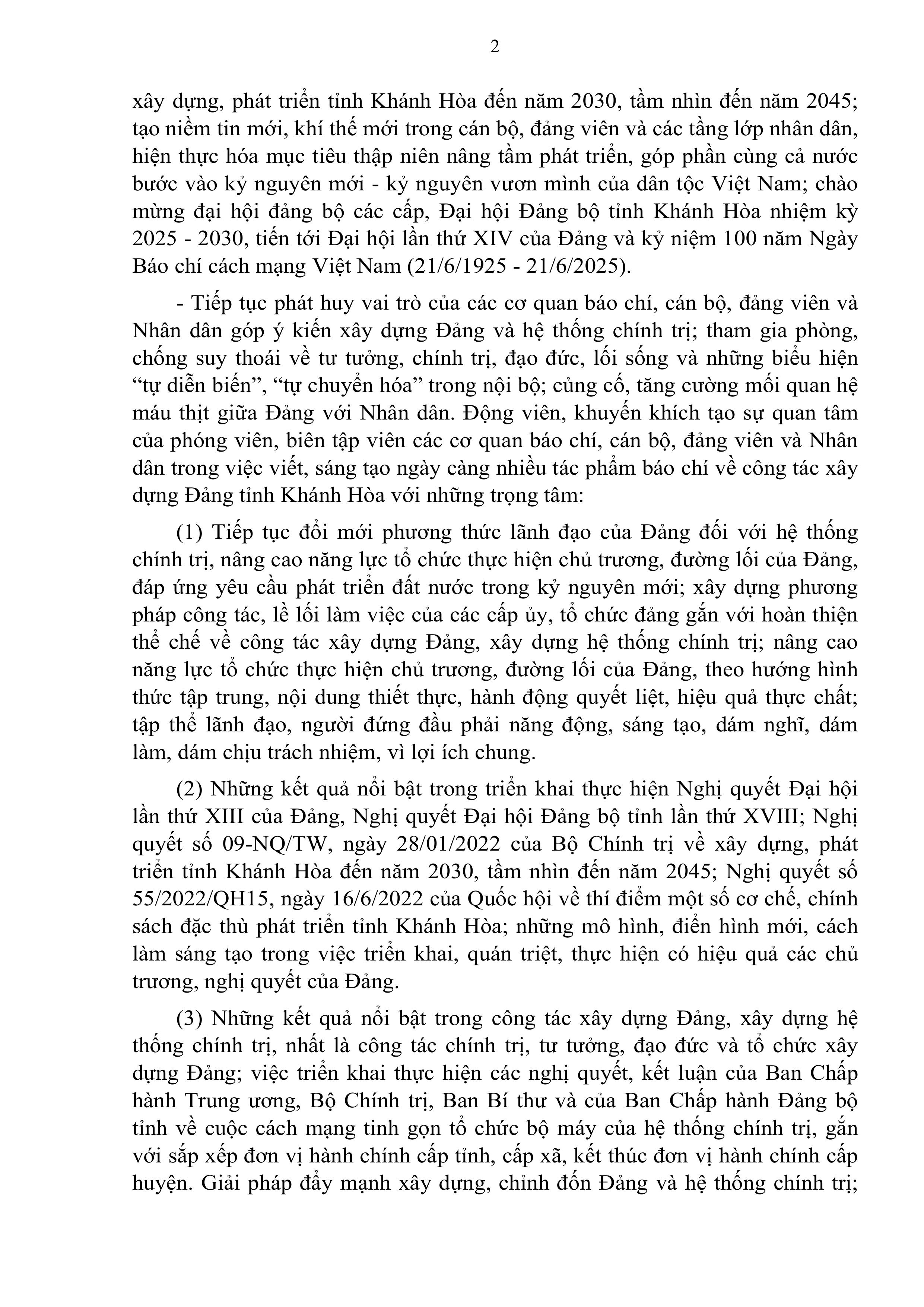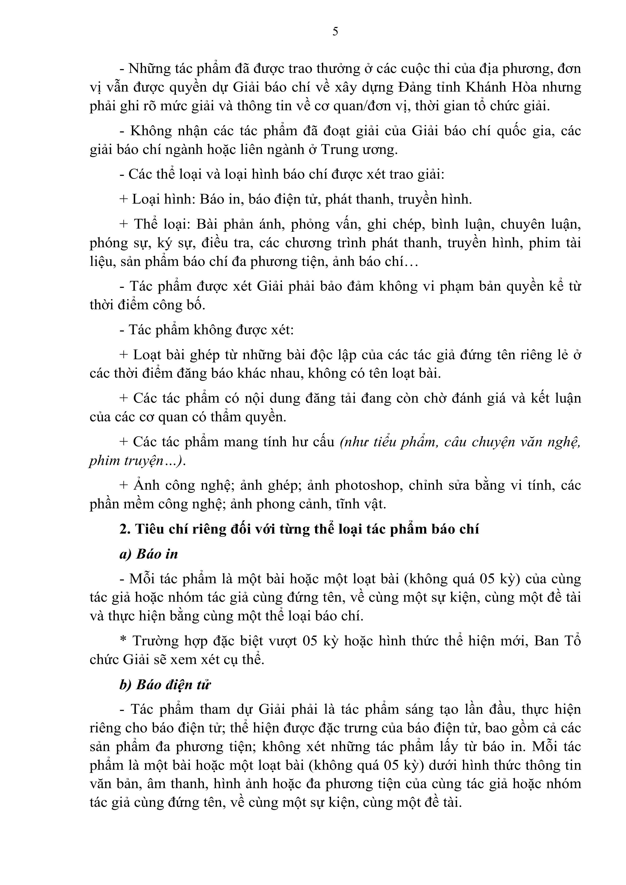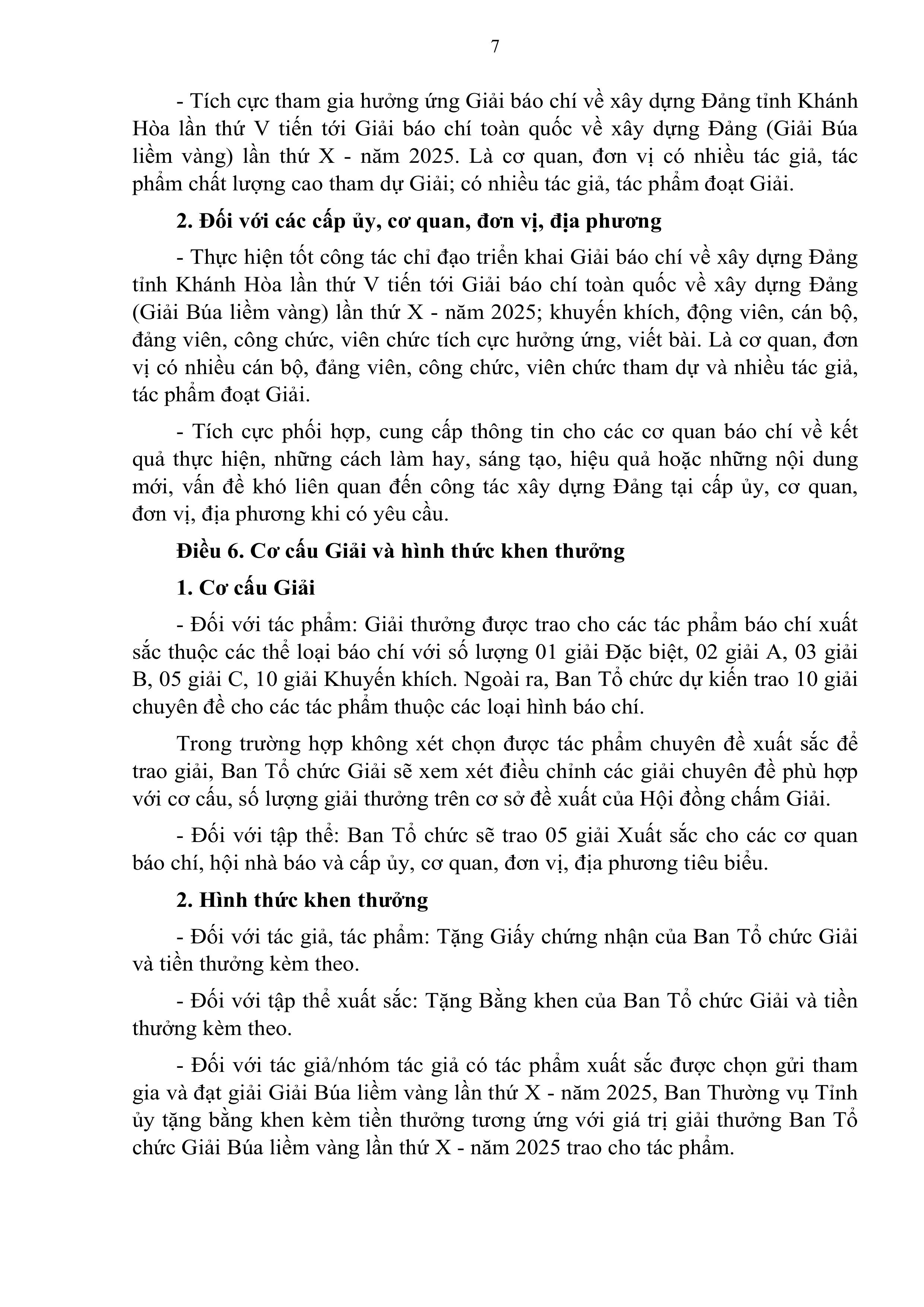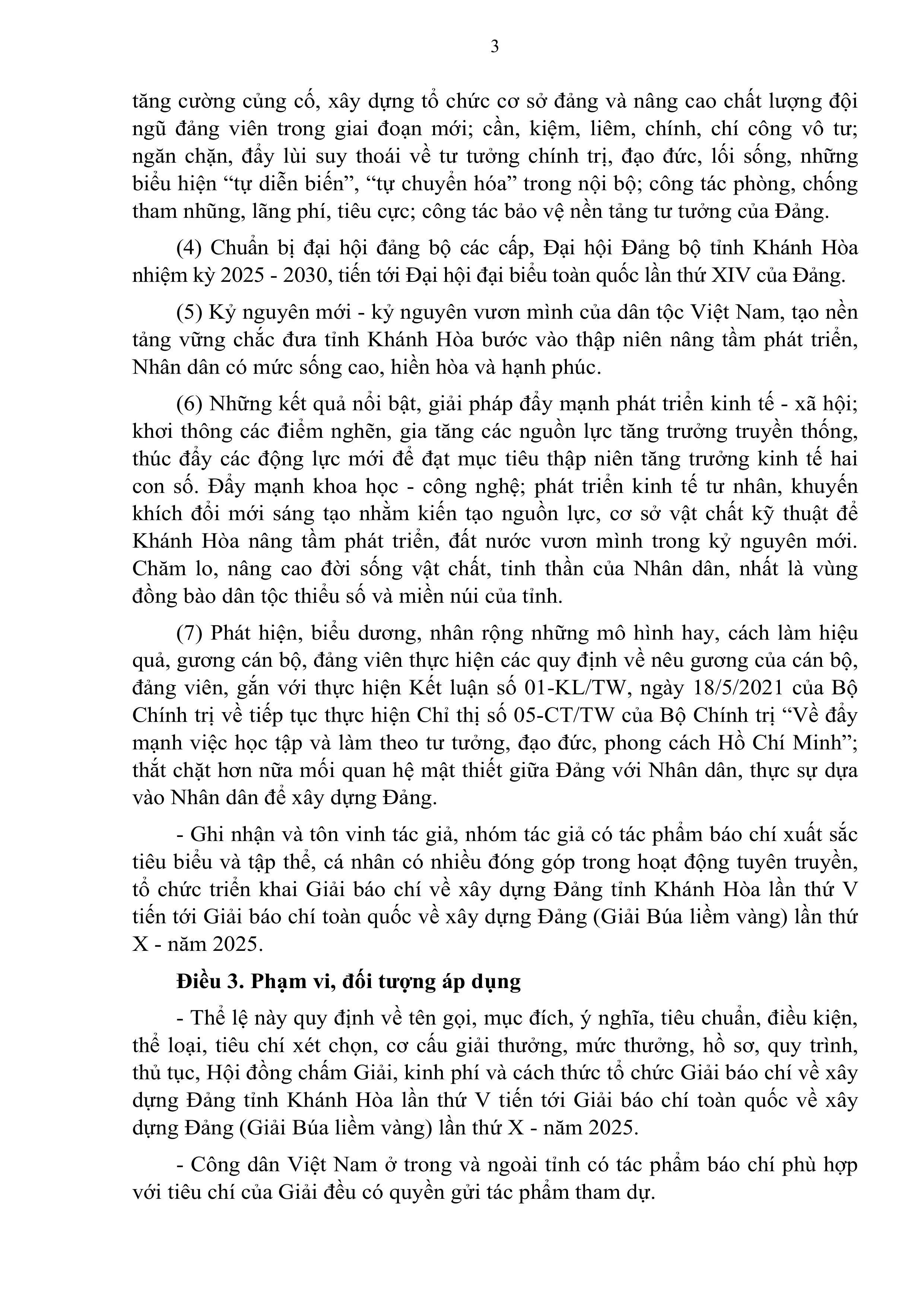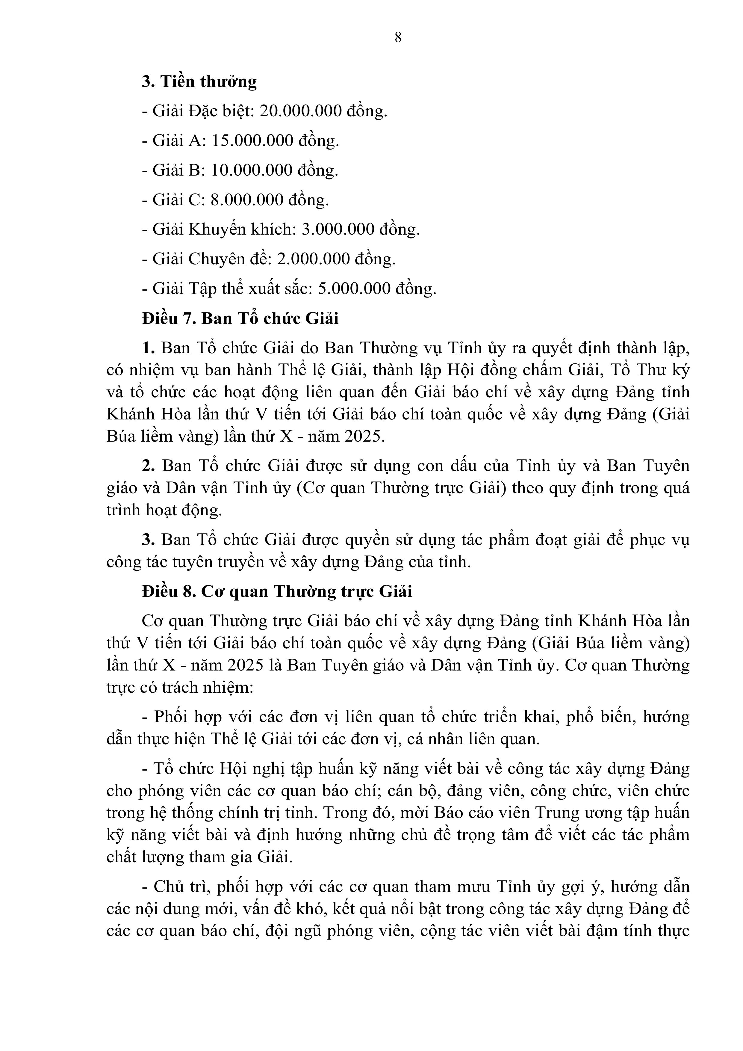 Thực hiện Kế hoạch số 269-KH/TU, ngày 31-3-2025 của Ban Thường vụ Tỉnh ủy tổ chức Giải báo chí về xây dựng Đảng tỉnh Khánh Hòa lần thứ V tiến tới Giải báo chí toàn quốc về xây dựng Đảng (Giải Búa liềm vàng) lần thứ X - năm 2025, Ban tổ chức Giải báo chí về xây dựng Đảng tỉnh đã ban hành Quyết định số 02, ngày 20-5-2025 về Thể lệ Giải báo chí về xây dựng Đảng tỉnh Khánh Hòa lần thứ V - năm 2025. Báo Khánh Hòa trân trọng giới thiệu nội dung thể lệ.