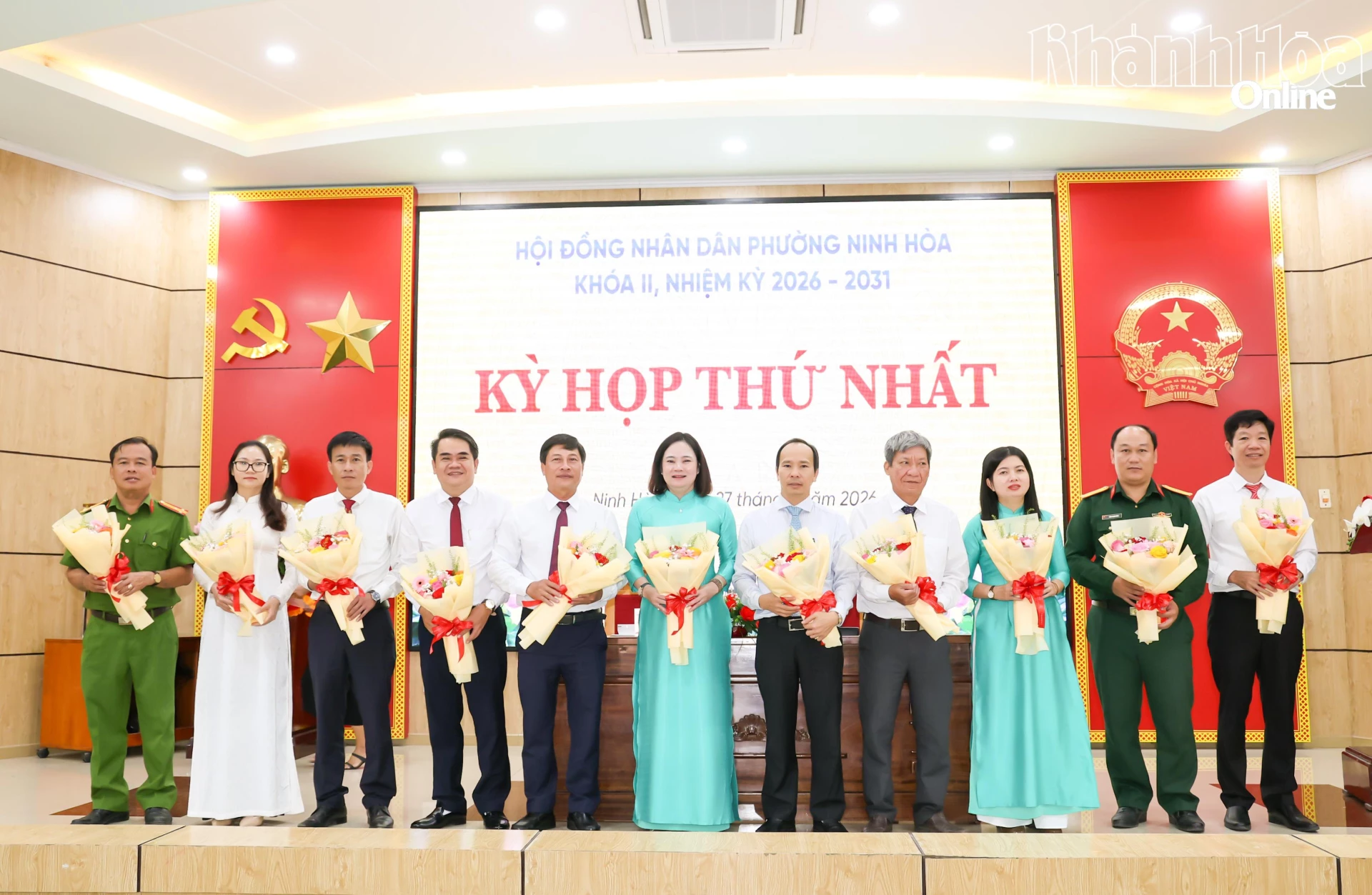 Kỳ họp cũng xem xét, thông qua các tờ trình về thành lập các ban của HĐND phường khóa II, nhiệm kỳ 2026 - 2031, đồng thời bầu các chức danh của UBND phường nhiệm kỳ 2026 - 2031. Bà Nguyễn Thị Hồng Hải - Phó Bí thư Đảng ủy, Chủ tịch UBND phường nhiệm kỳ 2021 - 2026 tiếp tục được bầu giữ chức Chủ tịch UBND phường nhiệm kỳ 2026 - 2031. Ông Nguyễn Sơn Vũ và ông Trần Hải Đăng - Phó Chủ tịch UBND phường nhiệm kỳ 2021 - 2026 tiếp tục được bầu giữ chức Phó Chủ tịch UBND phường nhiệm kỳ 2026 - 2031. Kỳ họp cũng thông qua tờ trình của Chủ tịch UBND phường Ninh Hòa về việc đề nghị bầu các Ủy viên UBND phường nhiệm kỳ 2026 - 2031.