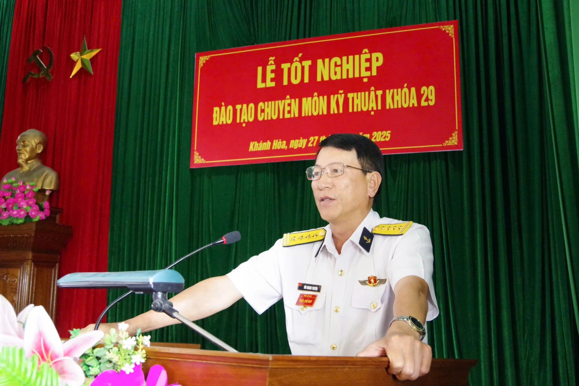 Phát biểu tại buổi lễ, Đại tá Bùi Quang Thuyên biểu dương những kết quả, thành tích cán bộ, học viên của trung tâm đã đạt được trong suốt quá trình đào tạo. Đồng thời, yêu cầu các học viên không ngừng học tập, rèn luyện và làm chủ kỹ thuật, nâng cao tác phong và năng lực công tác, qua đó tăng cường chất lượng sẵn sàng chiến đấu, đóng góp vào việc xây dựng Hải quân nhân dân Việt Nam ngày càng chính quy, hiện đại, bảo vệ vững chắc chủ quyền biển đảo của Tổ quốc.